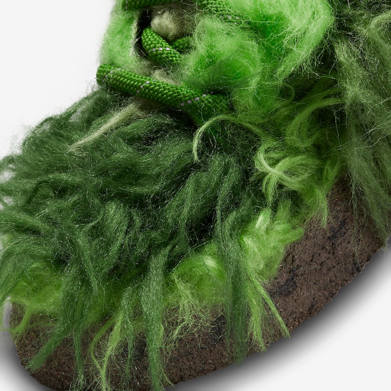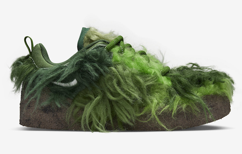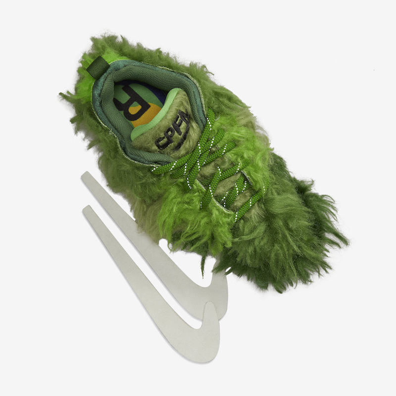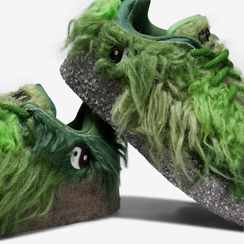 整双鞋采用绿色为主调,鞋面覆盖于着深浅不一的长毛材质,呈现出儿童动画中「绿毛怪格林奇」的造型,不仔细看还真看不出是以 Dunk 为蓝本进行得创作。