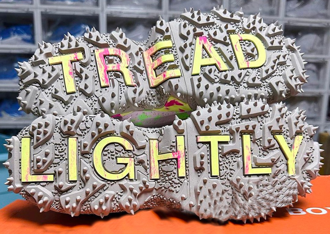 这双鞋可以看出一改 3% 的设计理念,采用多重材质解构鞋面,搭载夸张轮廓中底及钉鞋外底。