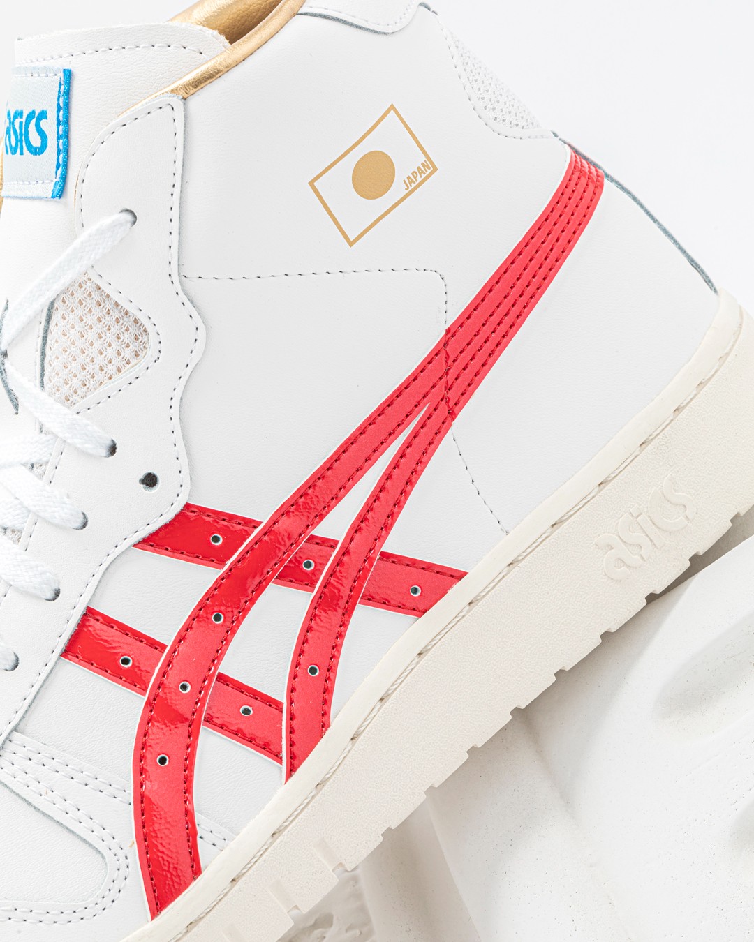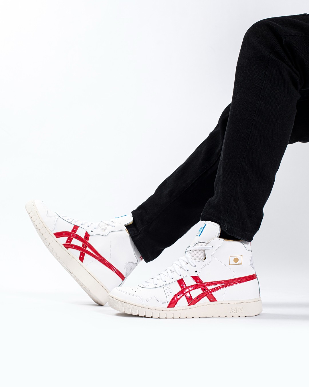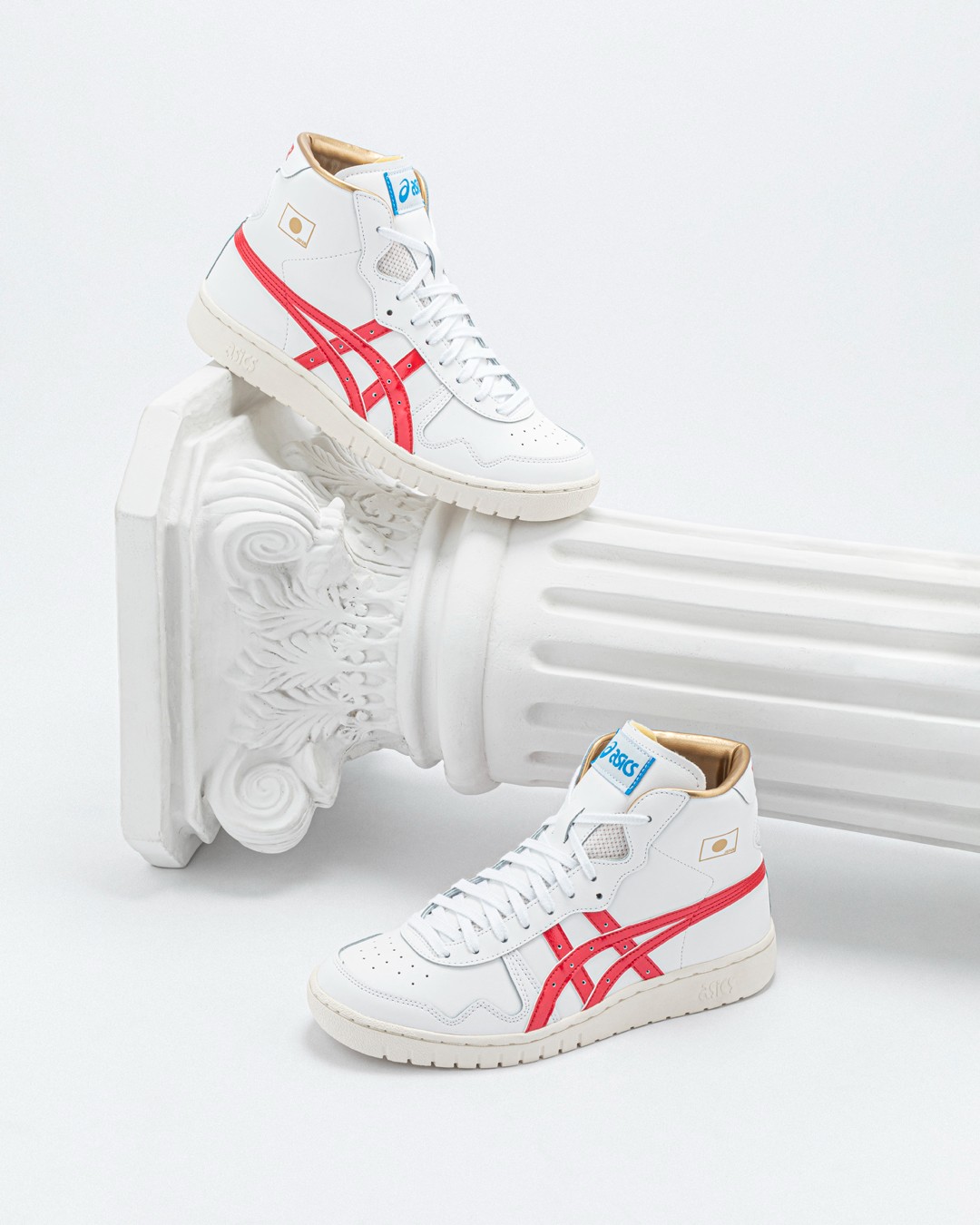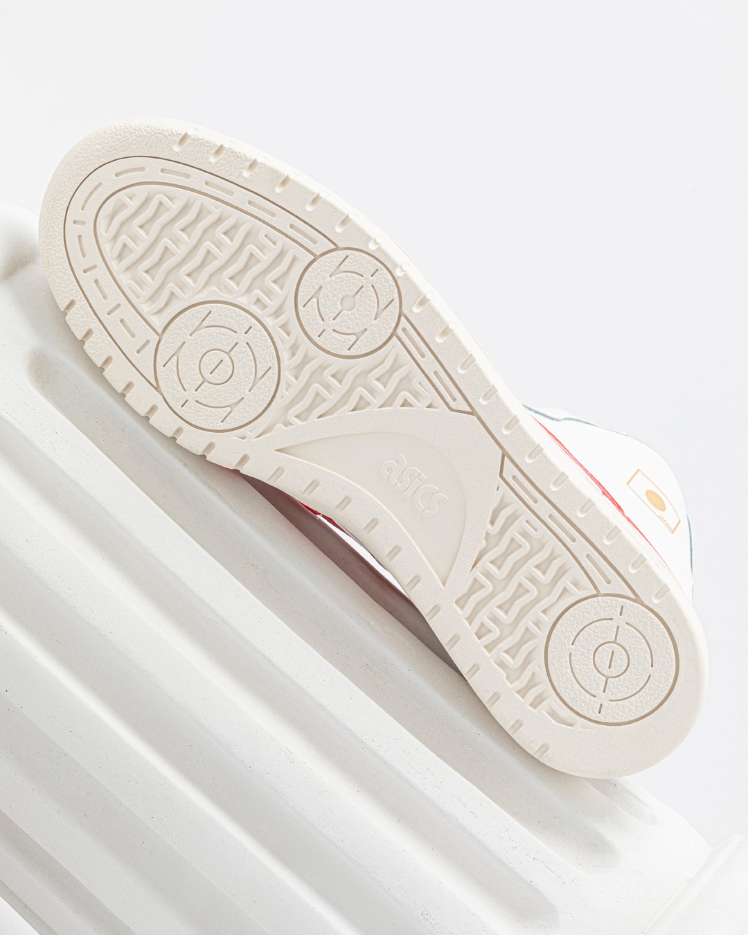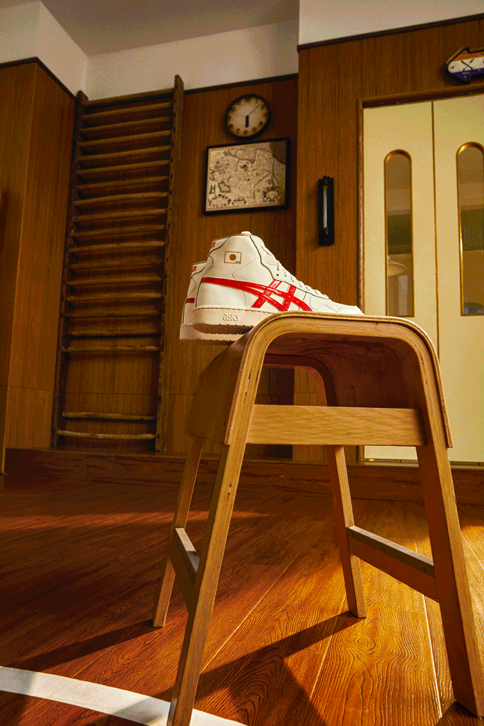 整双鞋以 Asics 篮球鞋历史上极具标志性的鞋款 JAPAN L 为蓝本进行创作,配色方案沿用了经典的白红造型呈现,与动漫中湘北篮球队主队队服配色一致。