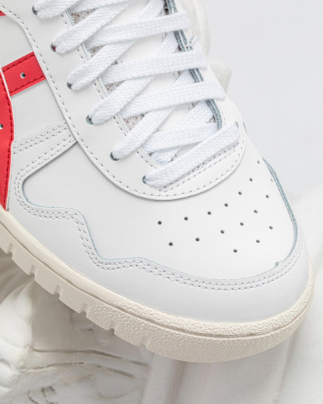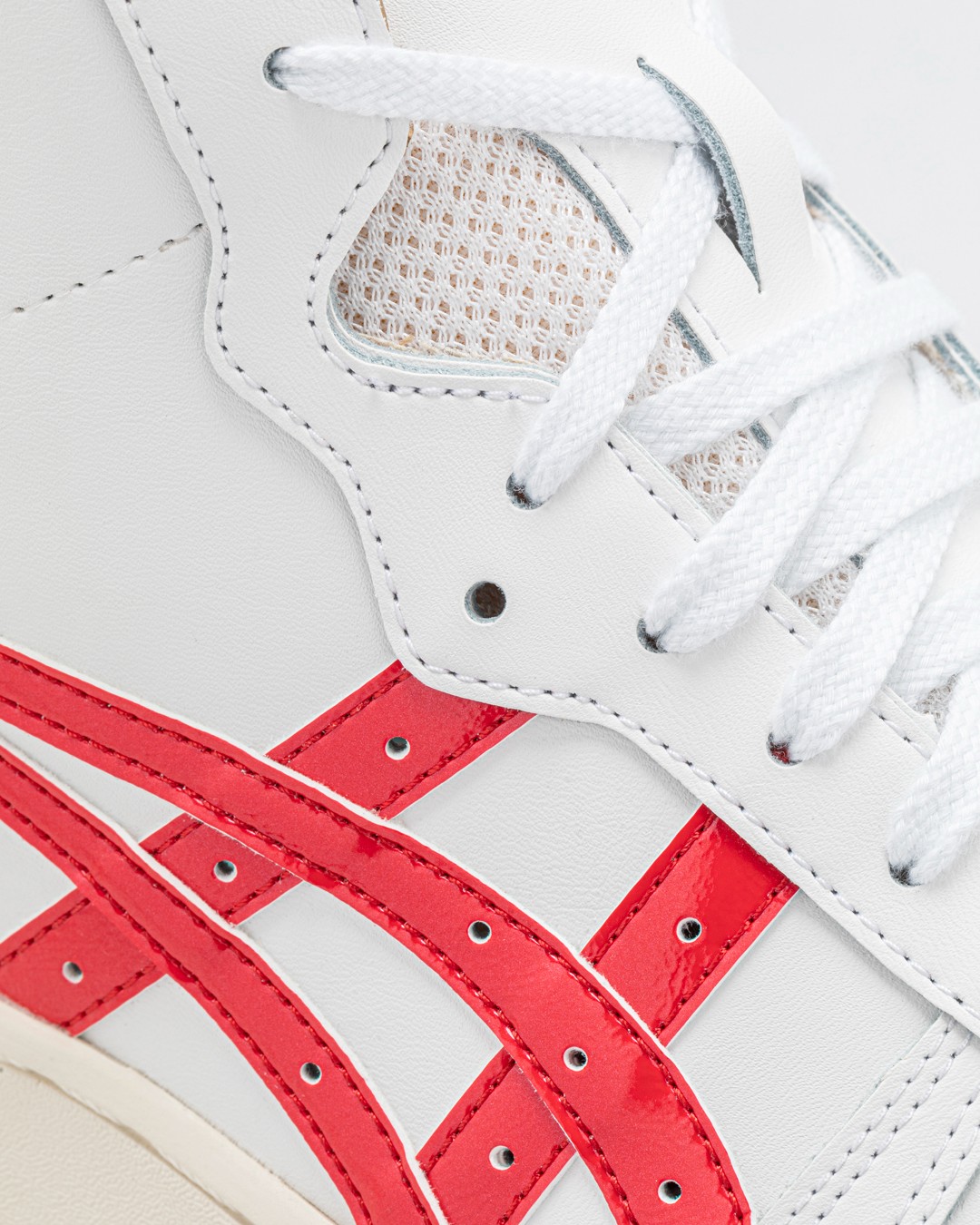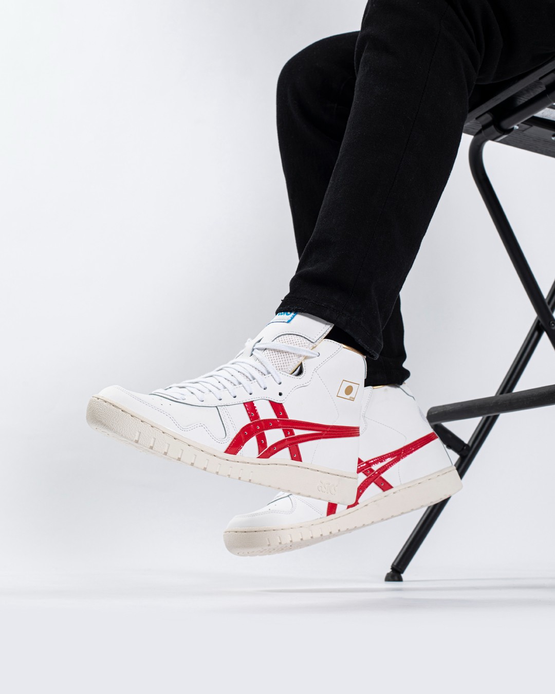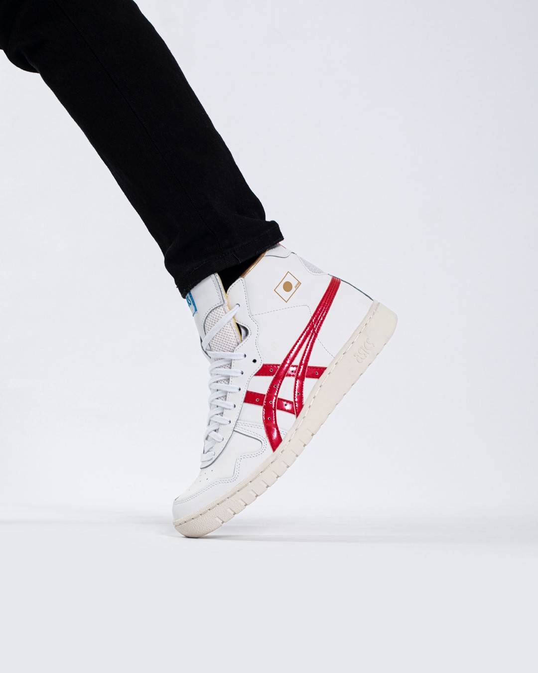 整双鞋以 Asics 篮球鞋历史上极具标志性的鞋款 JAPAN L 为蓝本进行创作,配色方案沿用了经典的白红造型呈现,与动漫中湘北篮球队主队队服配色一致。