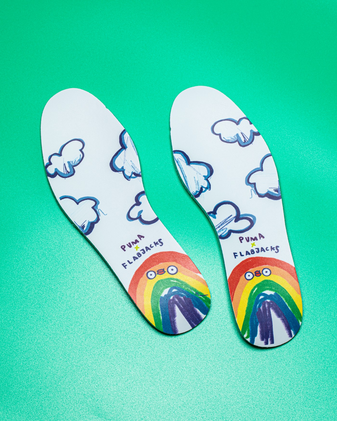 鞋垫设计让小编瞬间种草,印有 Ton Mak 标志性的彩虹图案饰人,上方印有 “PUMA” 和 “FLABJACKS” 字样,彰显联名身份。