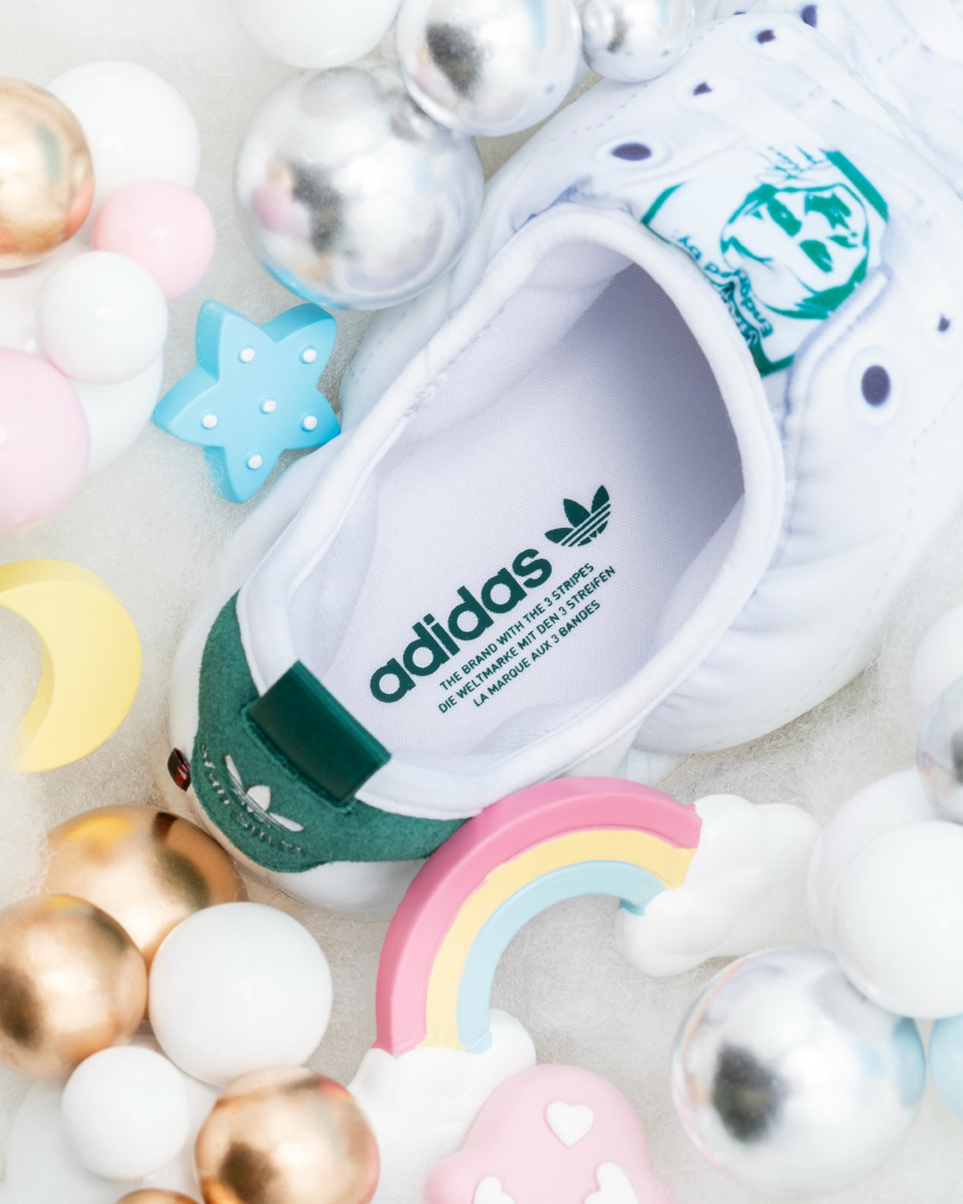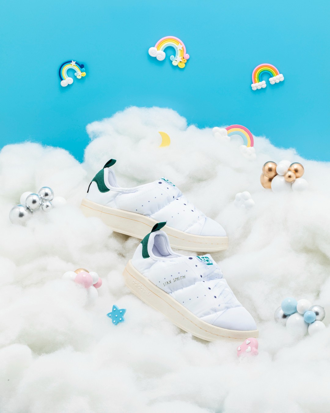 另一双将配色换成了同样经典的「绿尾」Stan Smith,除了图案的改变,材质、配置则与上一双相同。