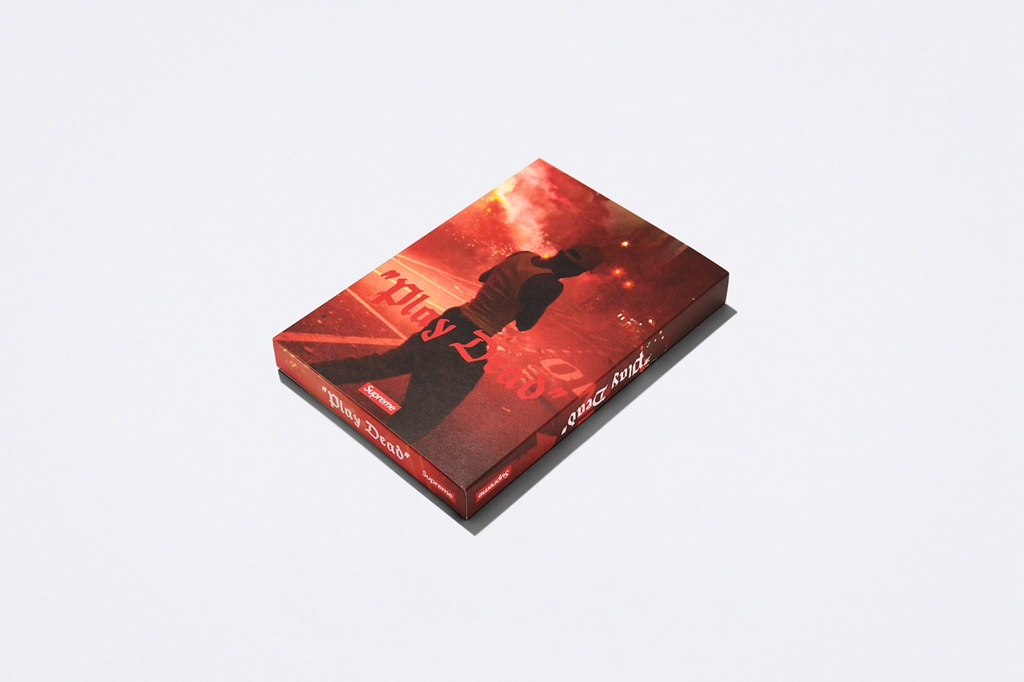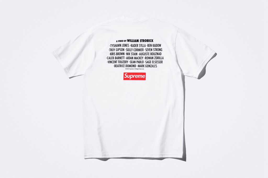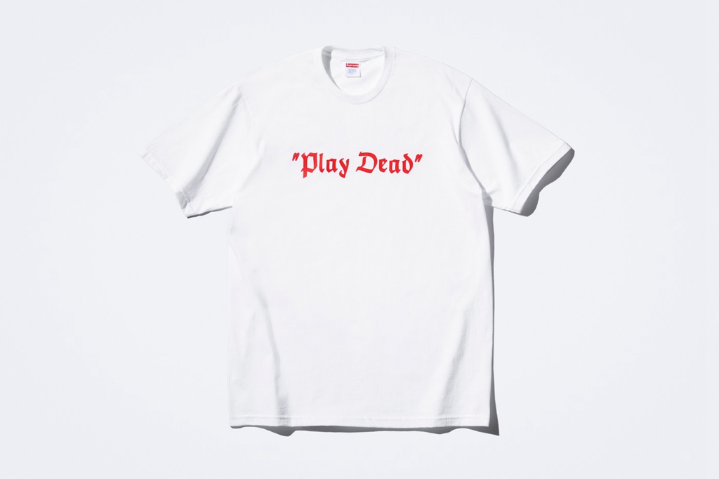 同时还有一件主题 T 恤登场,正面是红色的 “Play Dead” 字样,背面则点缀经典 Box Logo 和导演、滑手们的名字。
