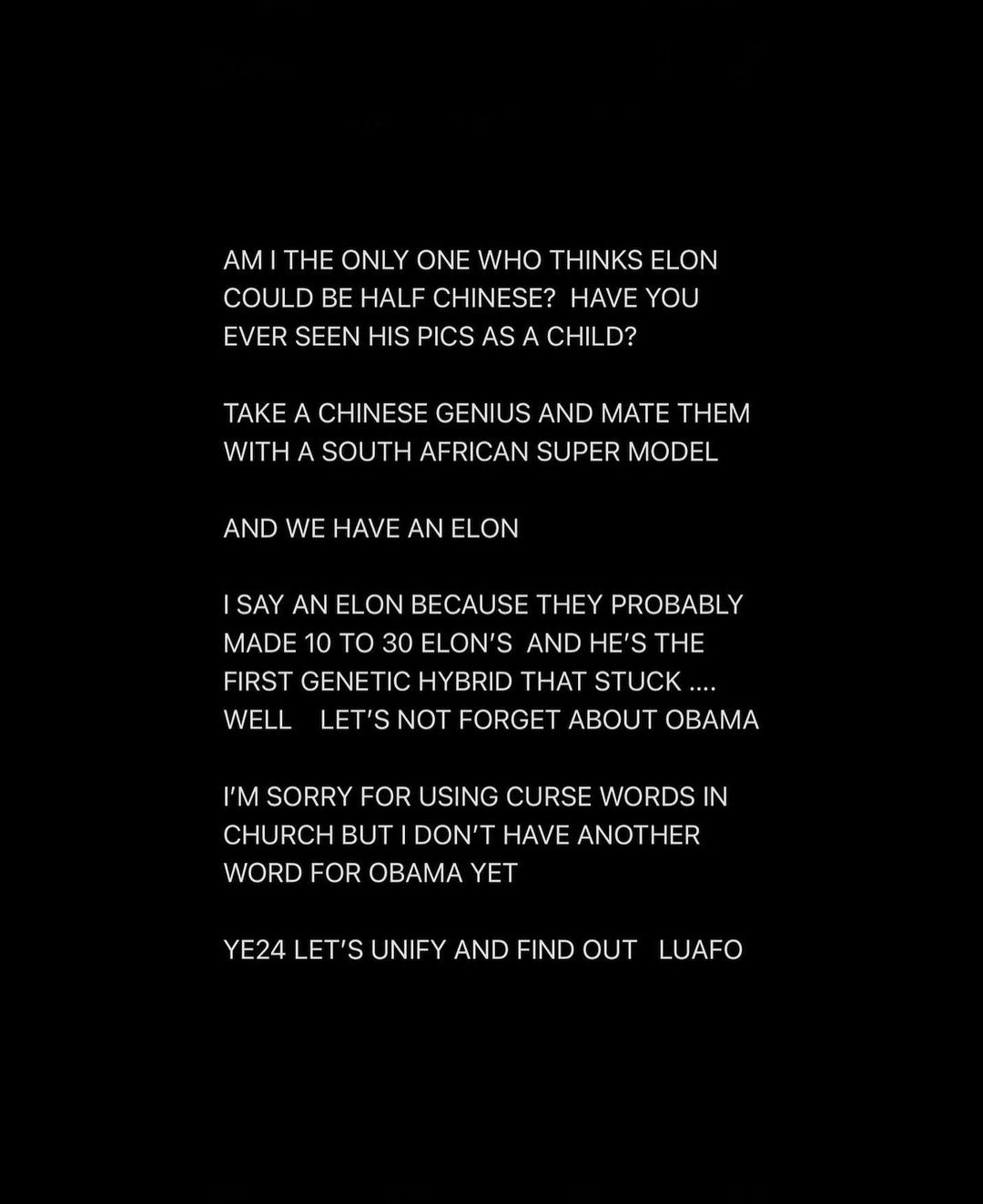 接下来的文字就让人看得云里雾里了,“让我们不要忘了奥巴马,我很抱歉在教堂里说脏话,但我找不到别的词来形容,Ye 在 2024 年要竞选总统,让我们团结起来,找出答案。”