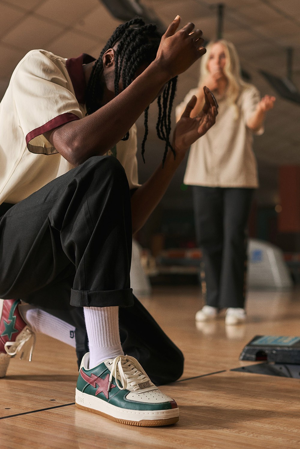 双方以「保龄球运动」为主题,全新 BAPE STA™ 采用与保龄球鞋相呼应的酒红与暗绿色拼接。
