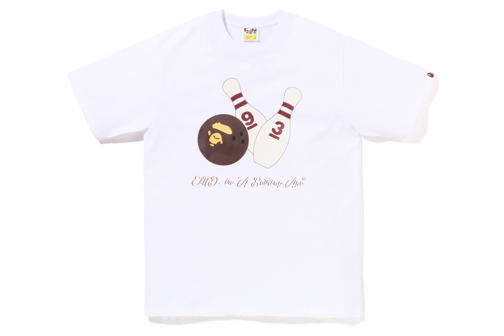 T 恤正面印有俏皮玩味的图案,保龄球瓶上印有 BAPE® 成立年份。