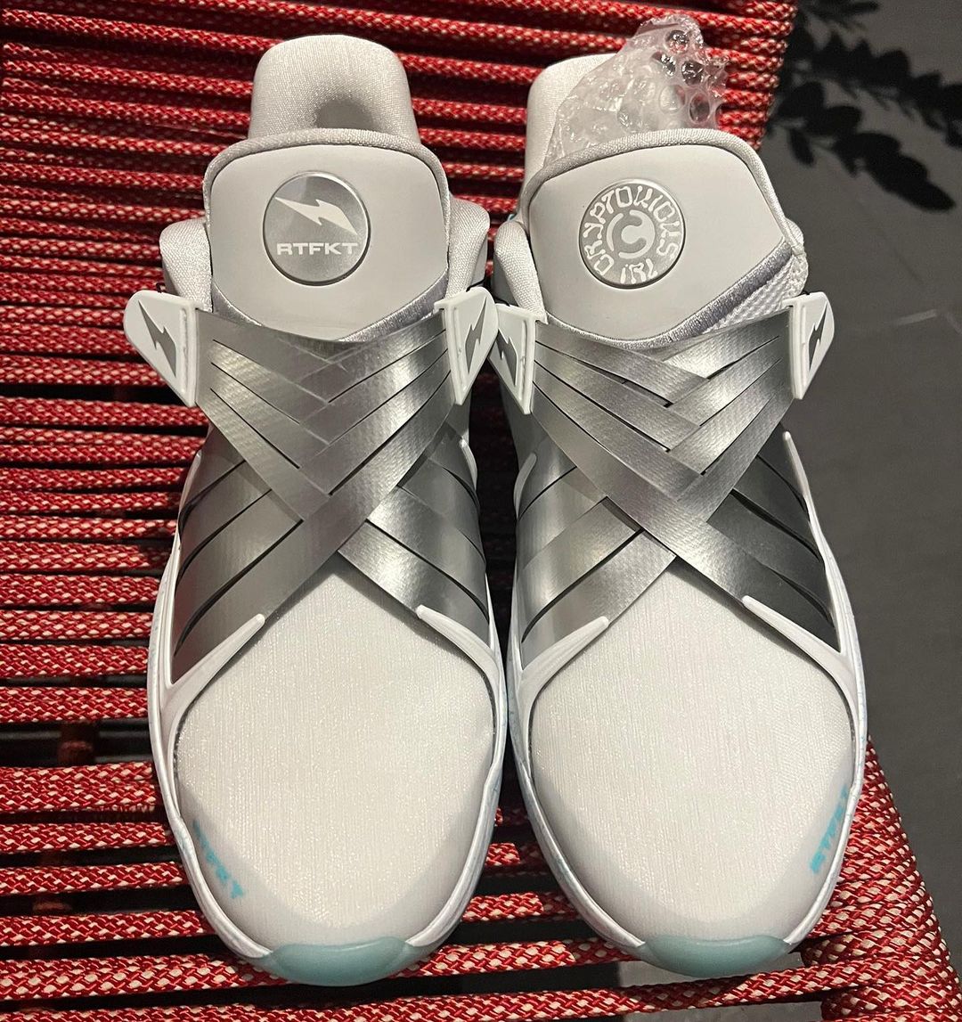 从这个角度可以更直接的感受到鞋带系统的夸张造型,RTFKT 标志出现在鞋舌、鞋带以及鞋头位置。