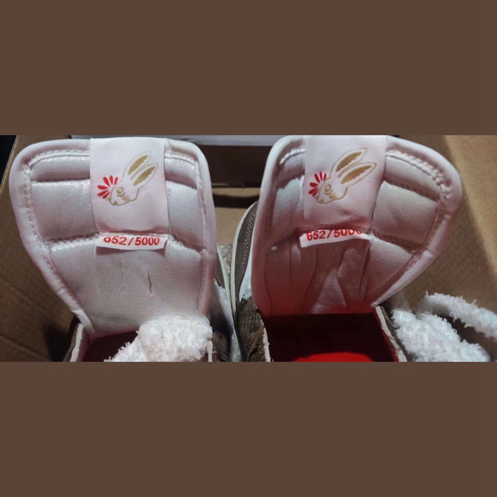 鞋舌内点缀兔子图案,呼应兔年主题,下方还有红色的疑似限量编号的数字。