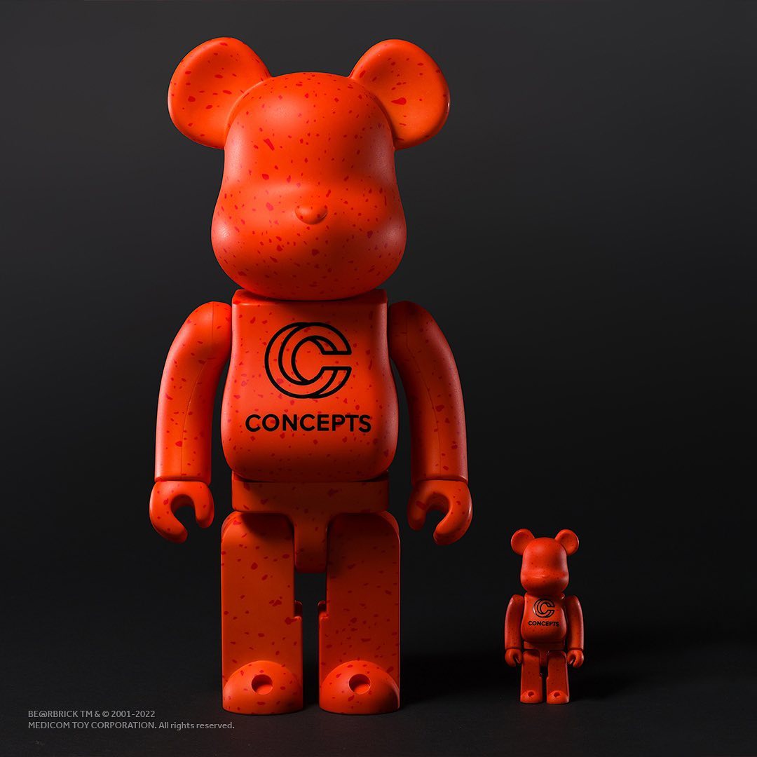 除祖传的橡胶绑带印有 20 周年 CONCPTS 字样外,还额外带有 400% +100% 的橙龙虾主题 BE@RBRICK,规格直接拉满。