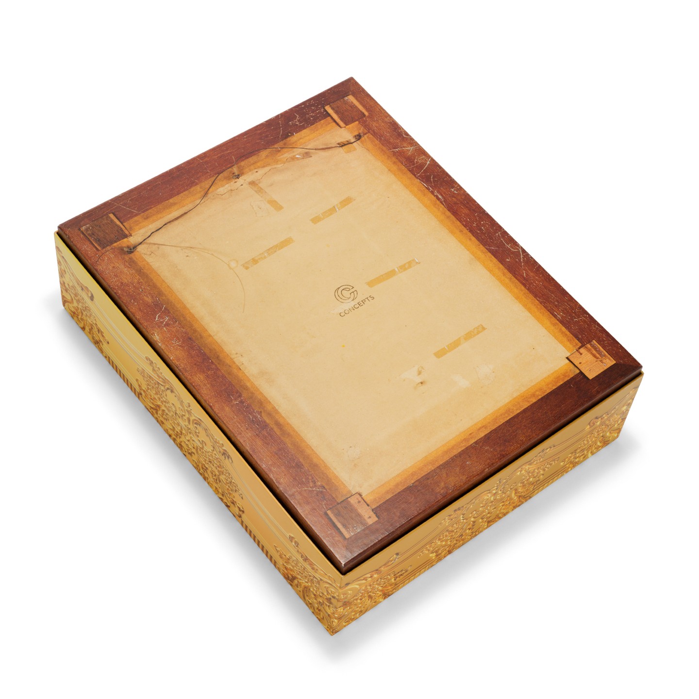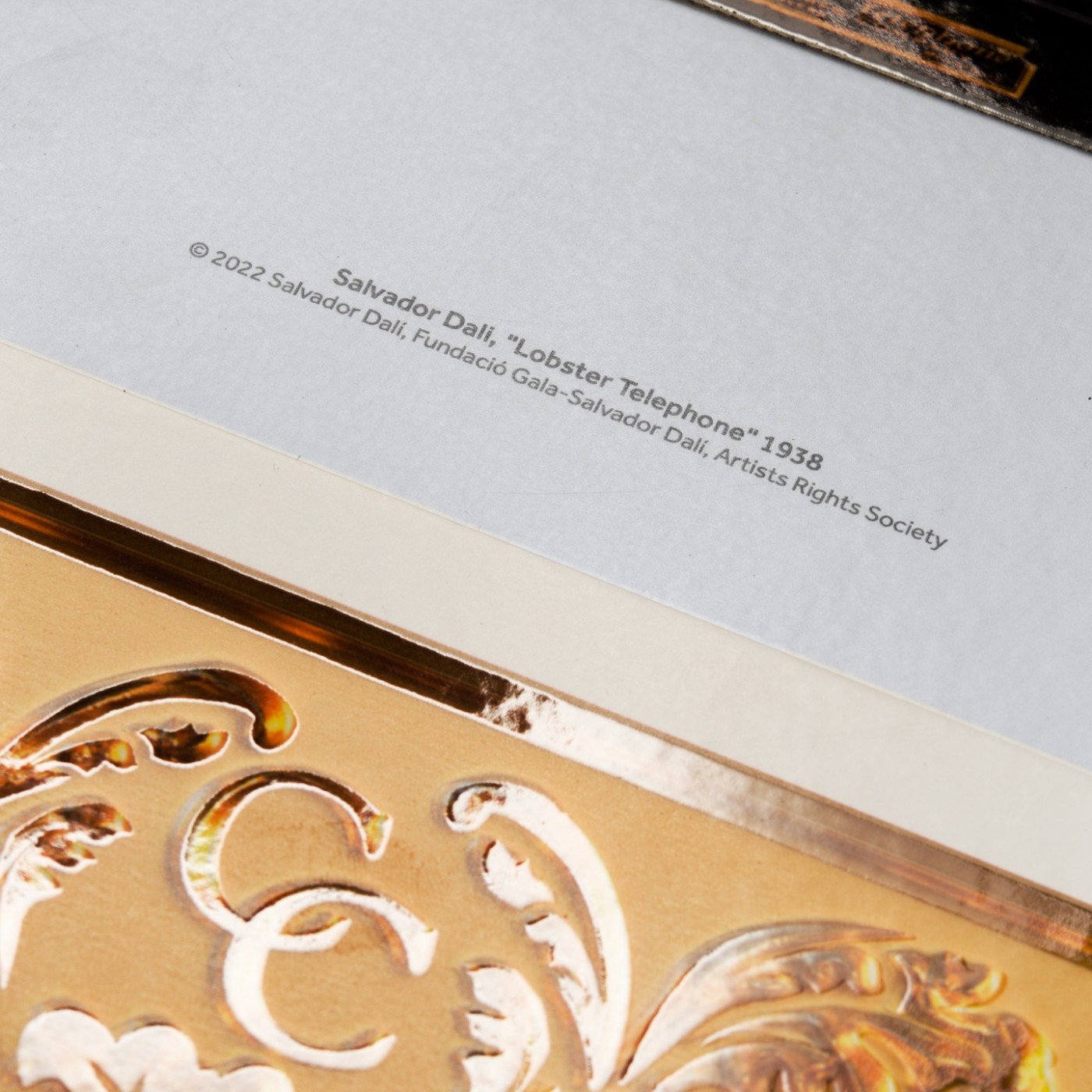 鞋盒采用古典画框呈现,正面图案醒目装裱萨尔瓦多•达利的《龙虾电话机》作品。