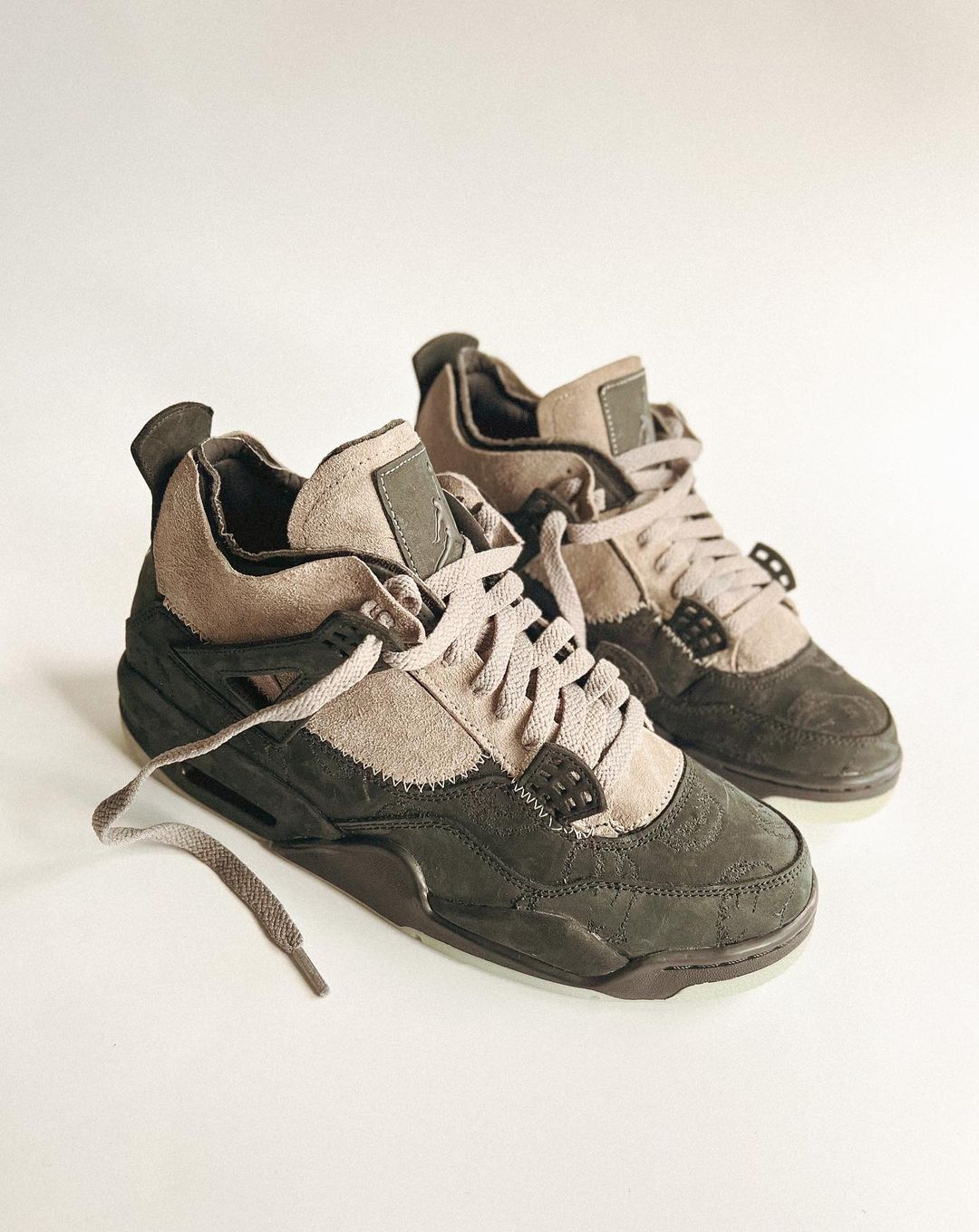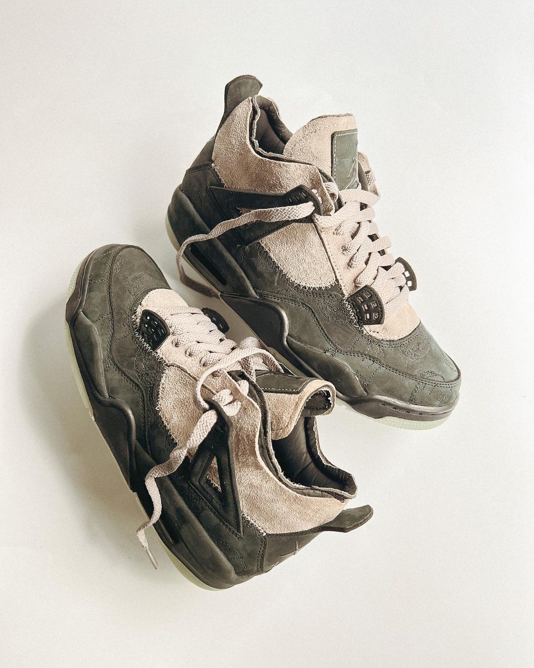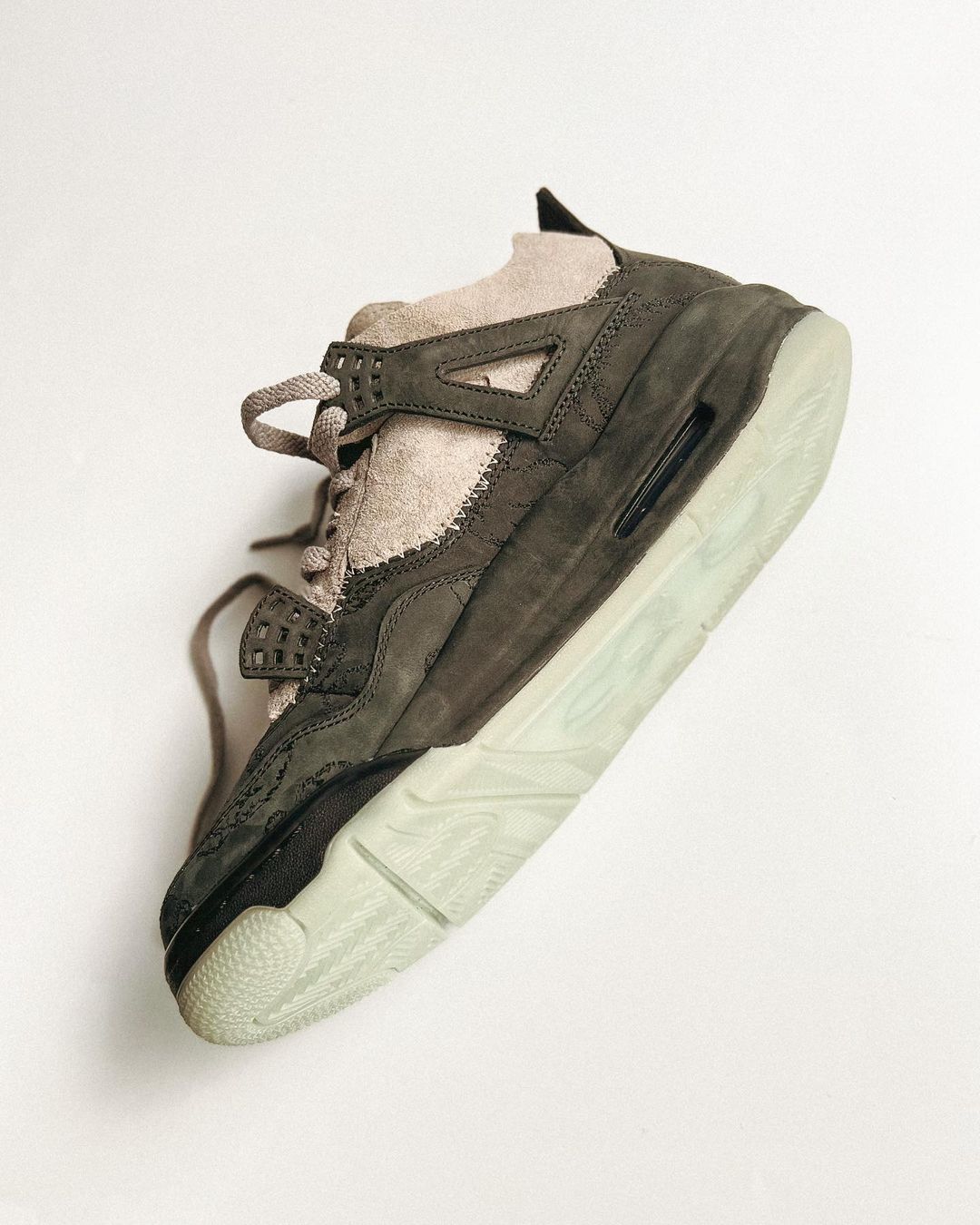 使得整体看起来更有层次感,并且同时致敬两款配色的原版 KAWS Air Jordan 4,也颇有 “半剖” KAWS 玩偶的感觉。