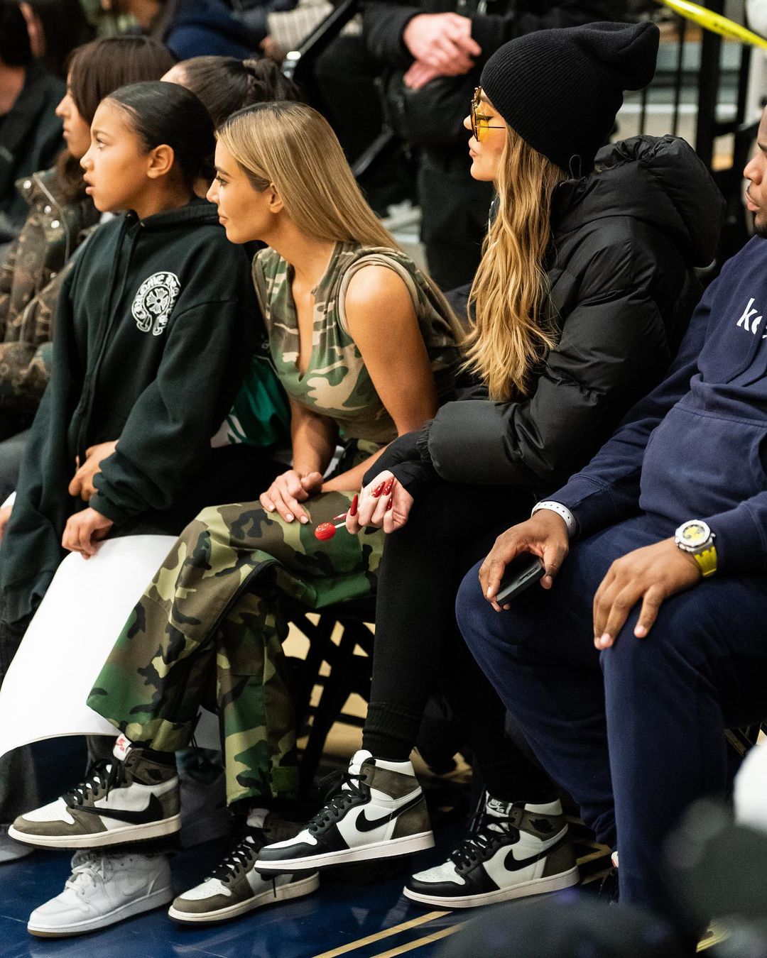 金卡戴珊和科勒卡戴珊现身球场,观看高中篮球赛。 金卡戴珊以一身帅气的迷彩装扮示人,看起来格外精神,气色不错。 但她脚上并没有穿 Yeezy 鞋款,而是搭配了一双 Traivs Scott x Air Jordan 1 倒钩! Traivs Scott 作为卡戴珊家族的女婿,这双鞋也算是自家出品。 她旁边的科勒卡戴珊则选用了一双类似配色的摩卡 Air Jordan 1 Mocha,目前女款尺码的市场价也超过了¥4000 元。 你给 Kim 这一身穿搭,打几分呢?