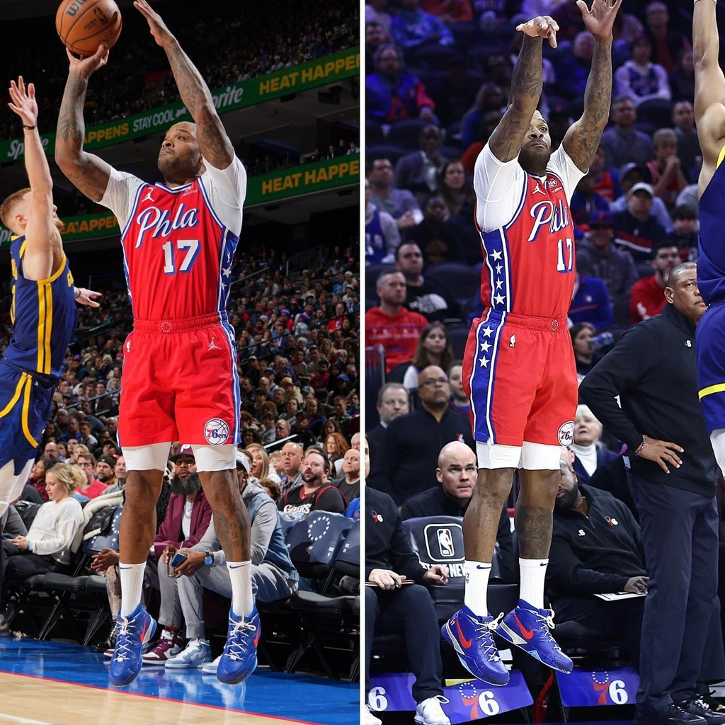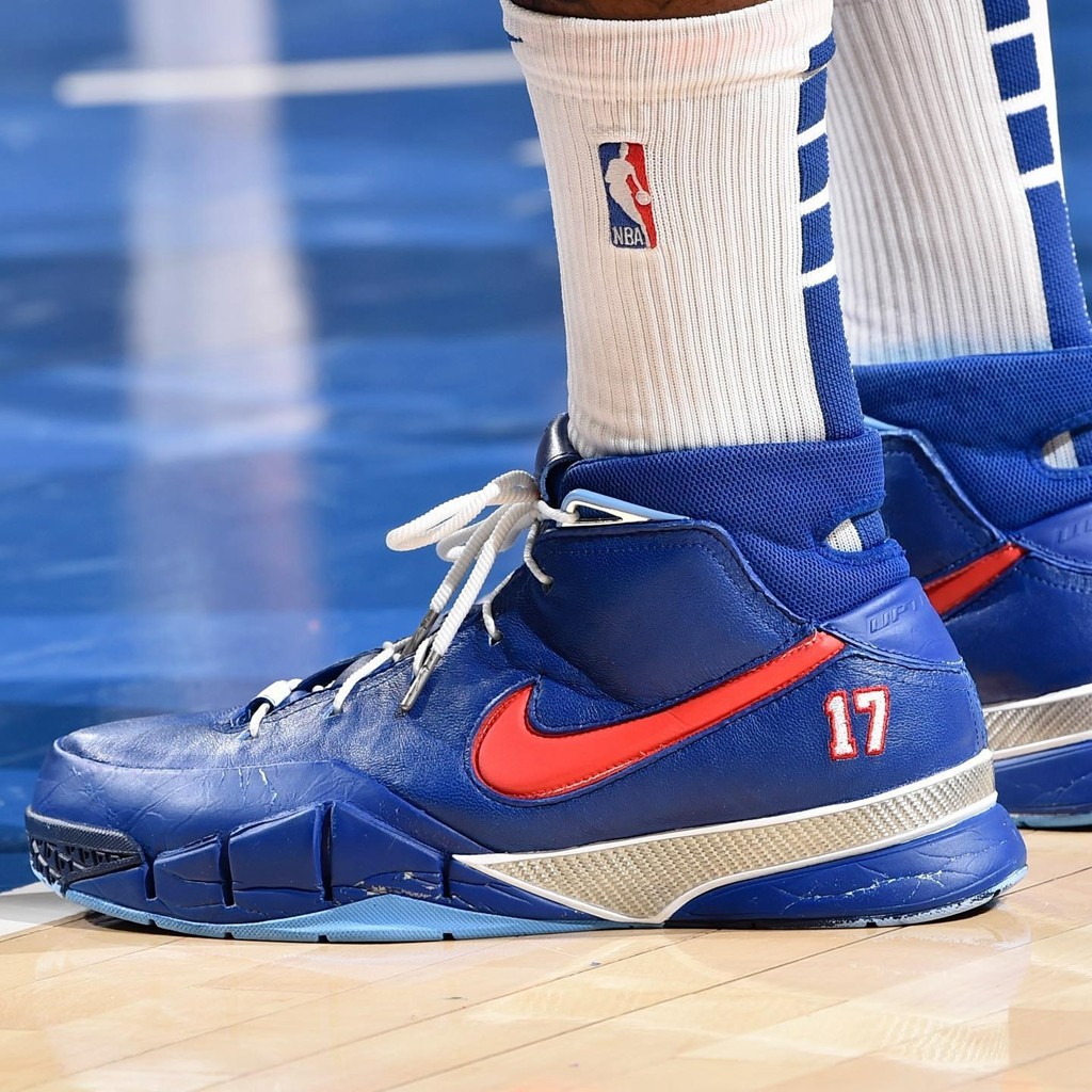 整体配色上就是 76 人经典的蓝红装扮,后跟处点缀塔克的 17 号刺绣,不少网友猜测这是 Nike 为他打造的 PE。