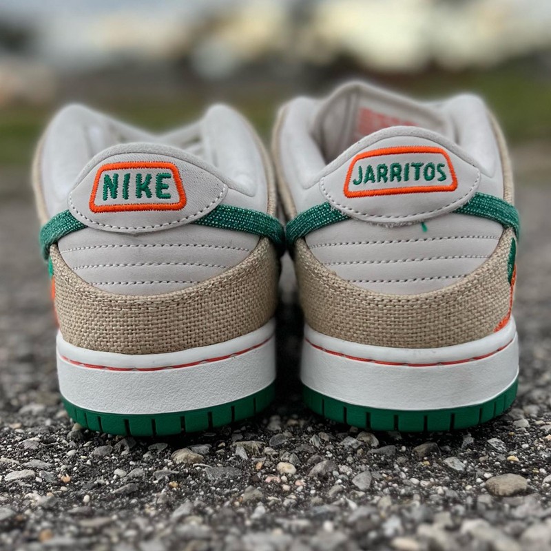 后跟带有橘色、绿色组成的果浆瓶 Logo,右脚后跟也则将原本的 Nike 字样改为了「JARRITOS」,彰显出联名配色身份。