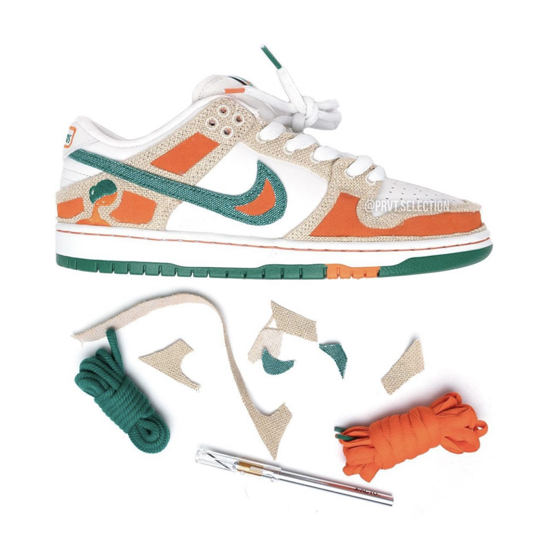 而且除了店铺、潮牌之外,什么食品、饮料公司都能联名,就比如最近刚曝光的 Jarritos x Nike Dunk SB Low。