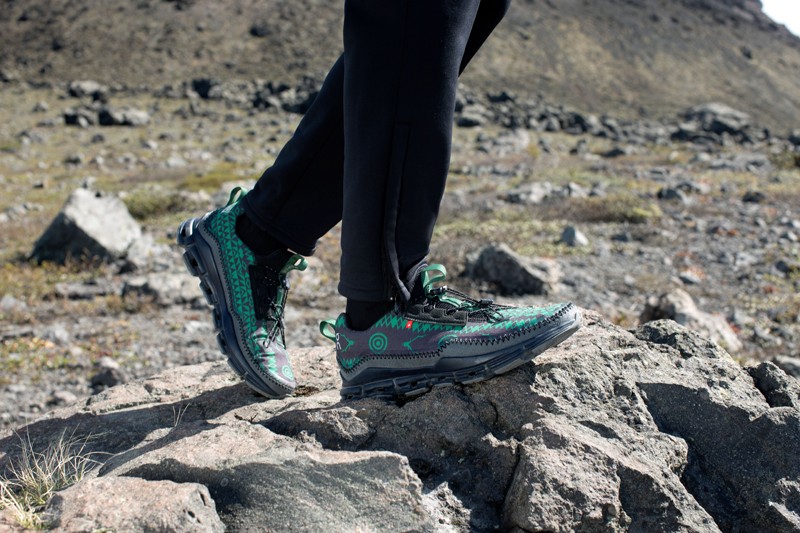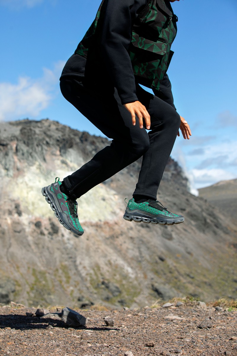 双方选择了户外风休闲鞋款 Cloudaway 为蓝本进行创作,鞋款以大面积绿色呈现,辅以不对称的 “SKULL & TARGET” 标志图腾印花进行妆点,整体视觉效果格外醒目。