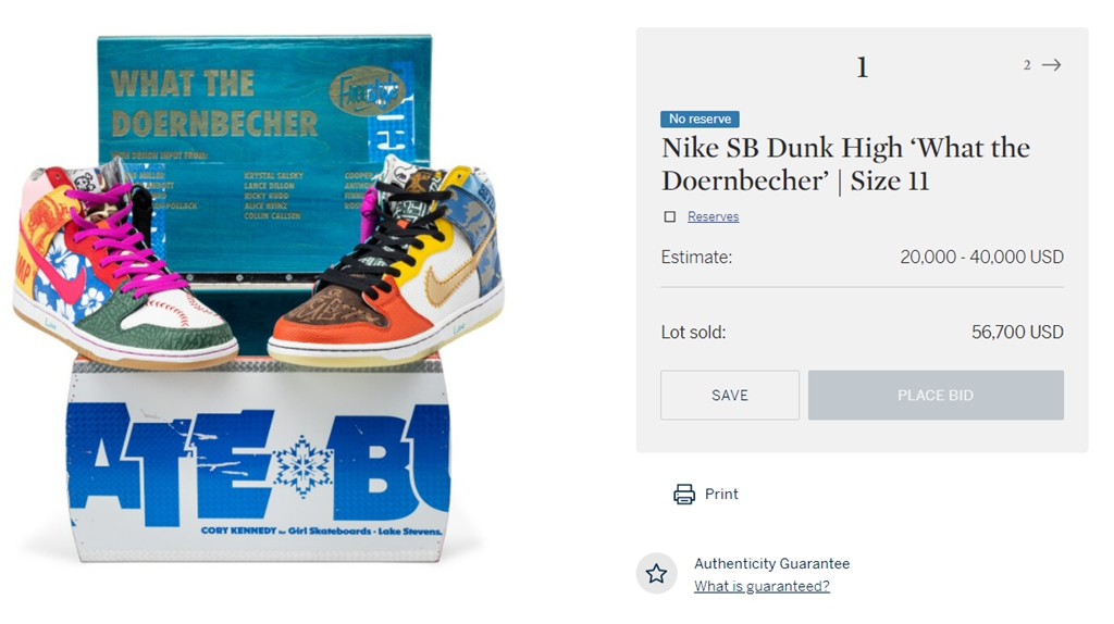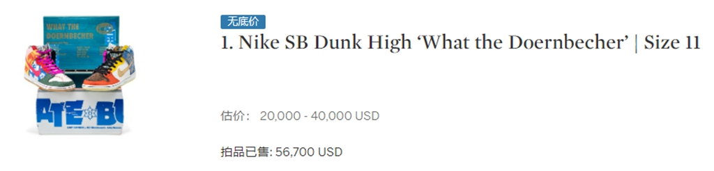 而本次的最大赢家,则归属于 Nike Dunk High “What The Doernbecher”,以 $56700 美元落锤,比预估价格高出小两万美元。