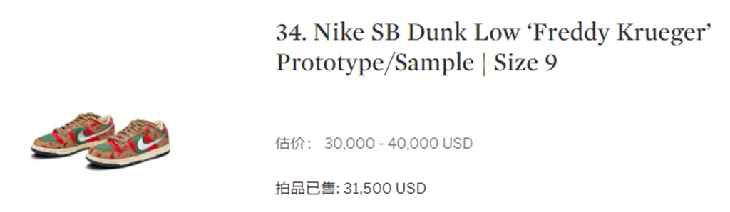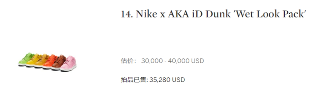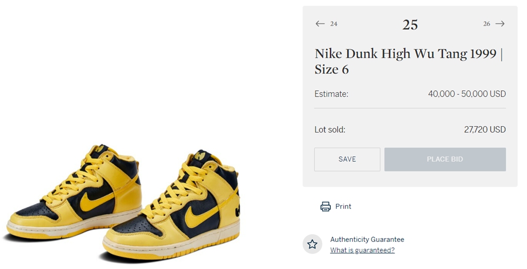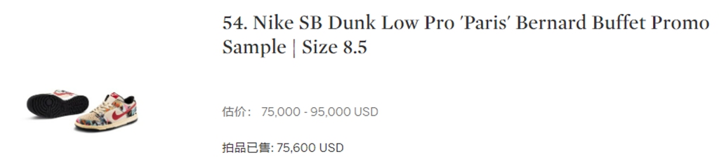 还有 1999 年元年版本的 Nike Dunk High “Wu Tang”,最终成交价比预估价低了足足一万多美元。