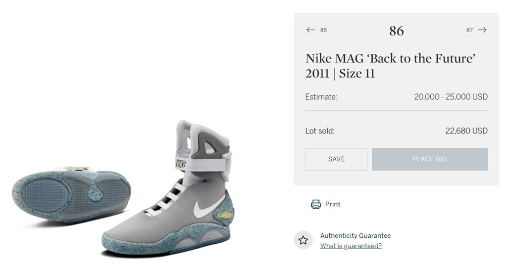 至于球鞋玩家们都梦寐以求的那双「回到未来」Nike Mag,此次表现中规中矩,但成交价没能进入拍卖的前十。