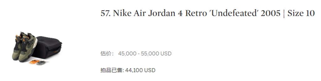 比如「镇店级」UNDEFEATED x Air Jordan 4,最终成交价甚至都没能达到官方的预估价格,属实有点失了排面。