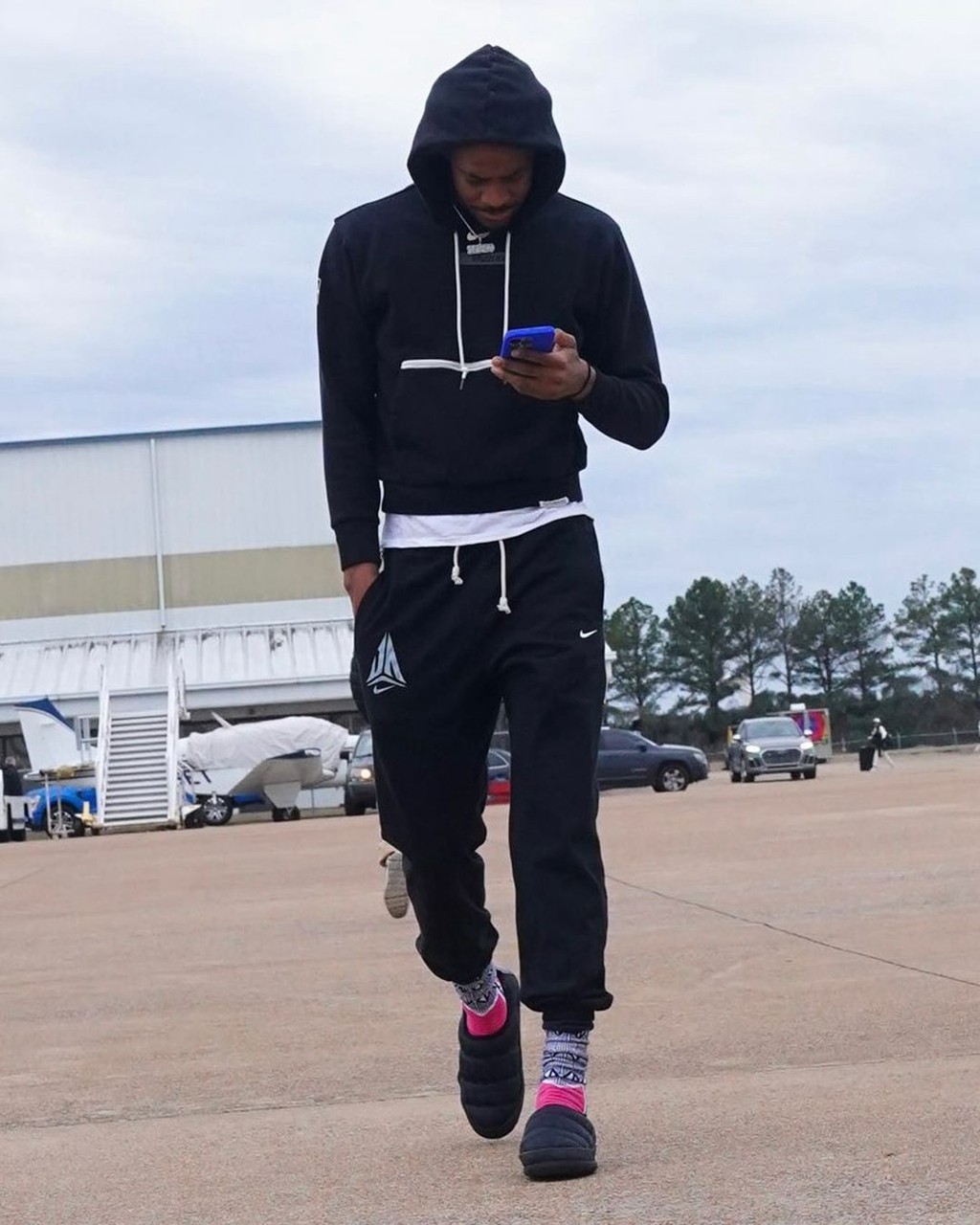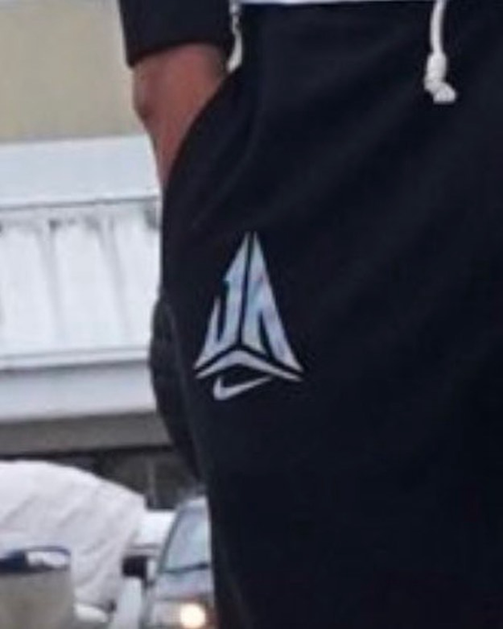 终于在最近,有海外媒体抓拍到,莫兰特在机场穿着一身运动套装,而裤子上印着神秘图案,疑似个人专属 Logo。