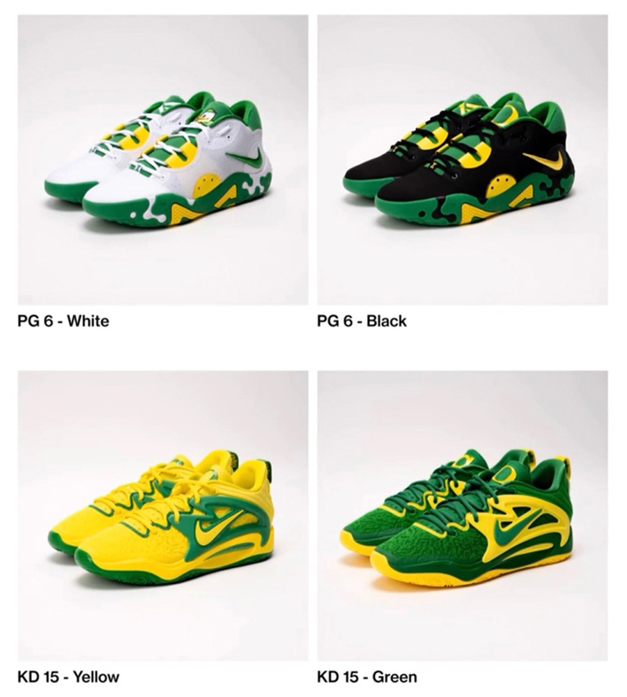 最后两款鞋型分别是 Nike PG6 和 LeBron 20,同样以黄绿造型呈现,营造出俄勒冈大学传统的造型,视觉效果相当吸睛。