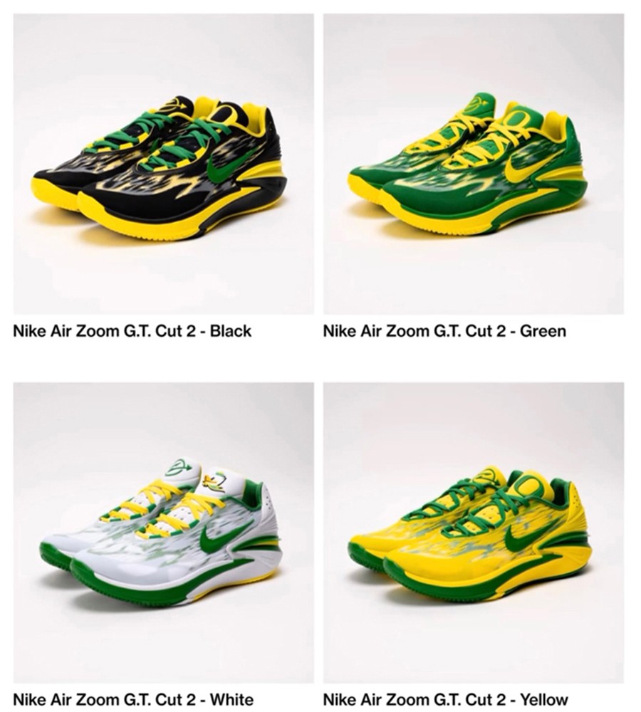 其次 KD15 和 Air Zoom G.T. Cut 2 同样打造了黄、白、绿和黑四款配色,并在鞋舌上点缀了俄勒冈标志性的鸭子头像和「O」字 Logo。