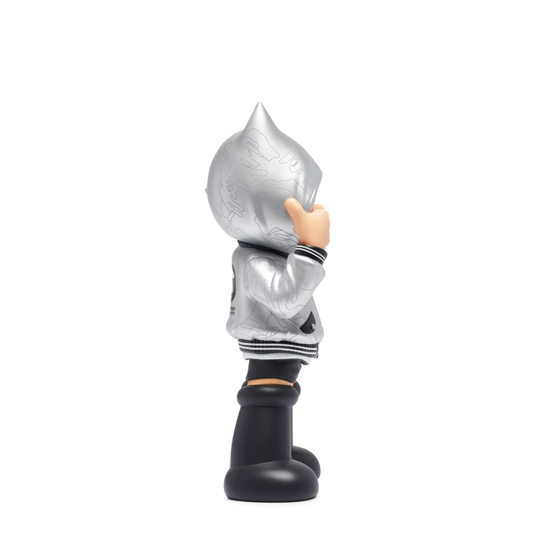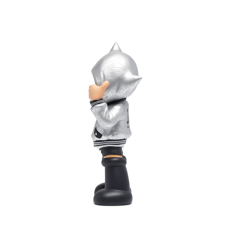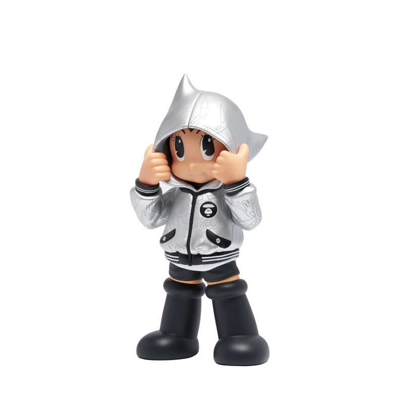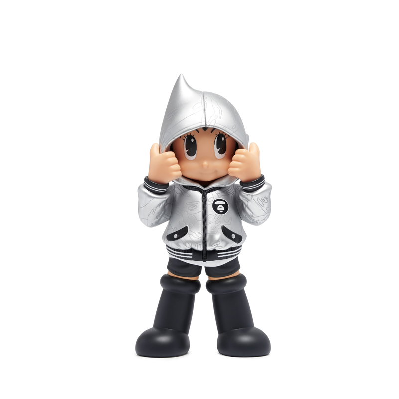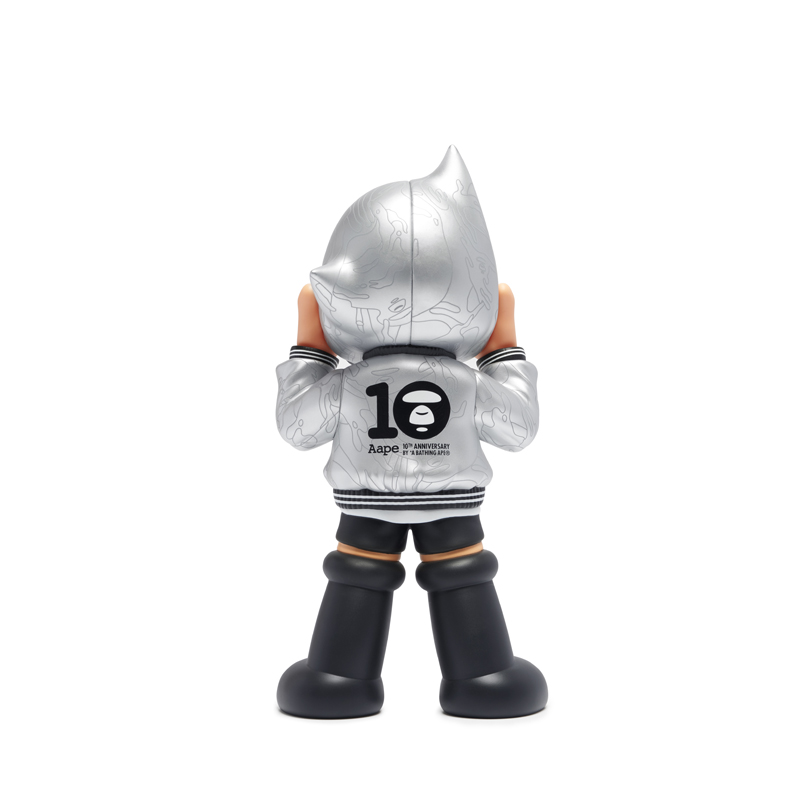 其次,则是在本周二悄悄登场的 AAPE x 阿童木限量手办,整个玩具高 26cm,外型采用了银色与黑色组成,在保证了高颜值的情况下,也契合了此次 10 周年特辑的主题。