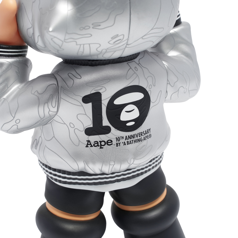 细节方面也是非常可圈可点,银色的外套上印有 AAPE 10 周年猿颜迷彩,背面则印有周年 Logo,彰显出了特殊的联名身份。