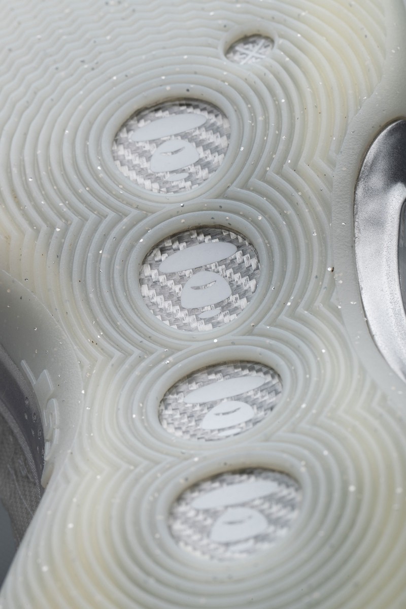 中底的全掌异形碳纤纹板融入了多个 MOONFACE 头像,既丰富了鞋身细节,还呼应了联名主题。