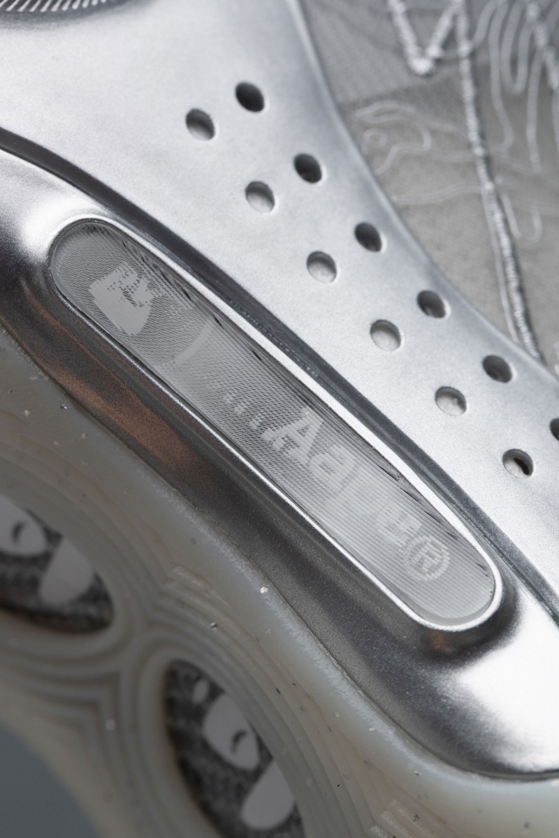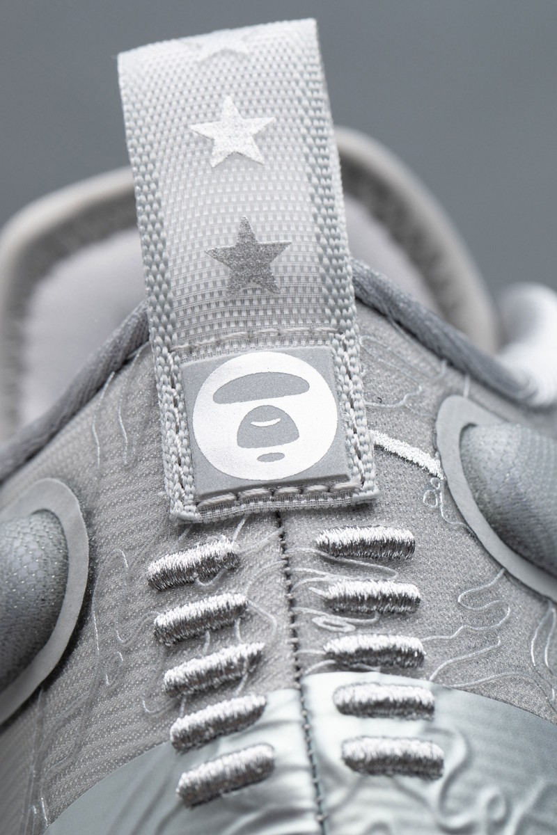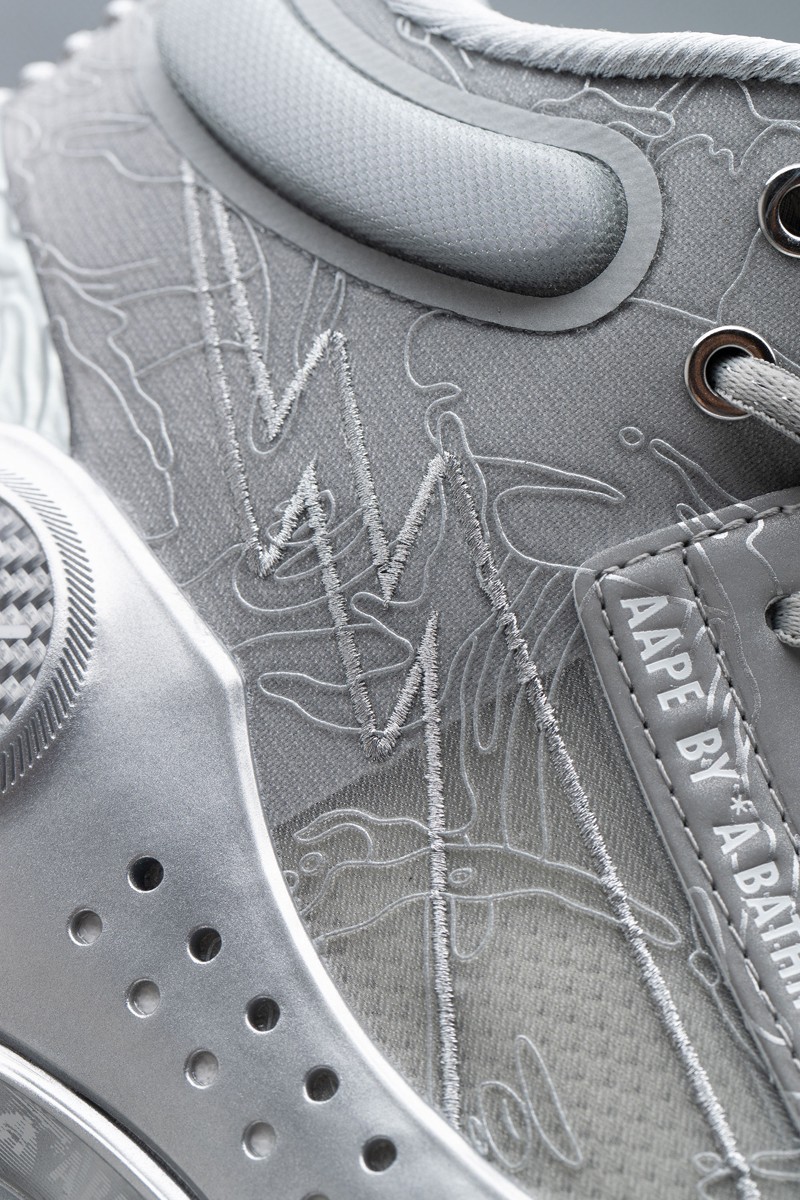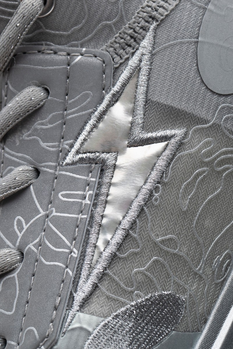 整双鞋通体采用电镀银色打造,侧身的织物鞋面在保留闪电 Logo 的同时,还加入了最能代表 AAPE 的迷彩图案。