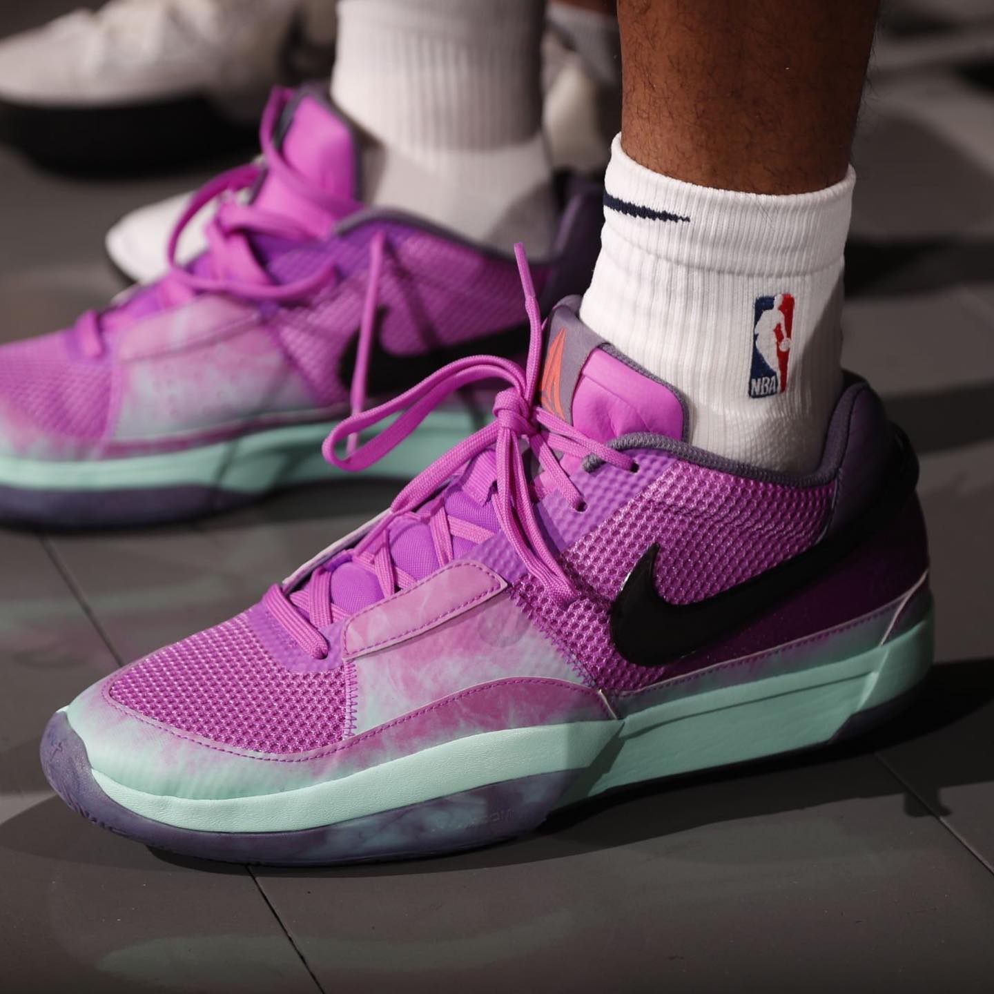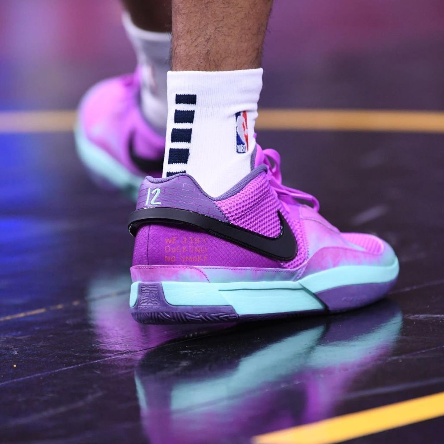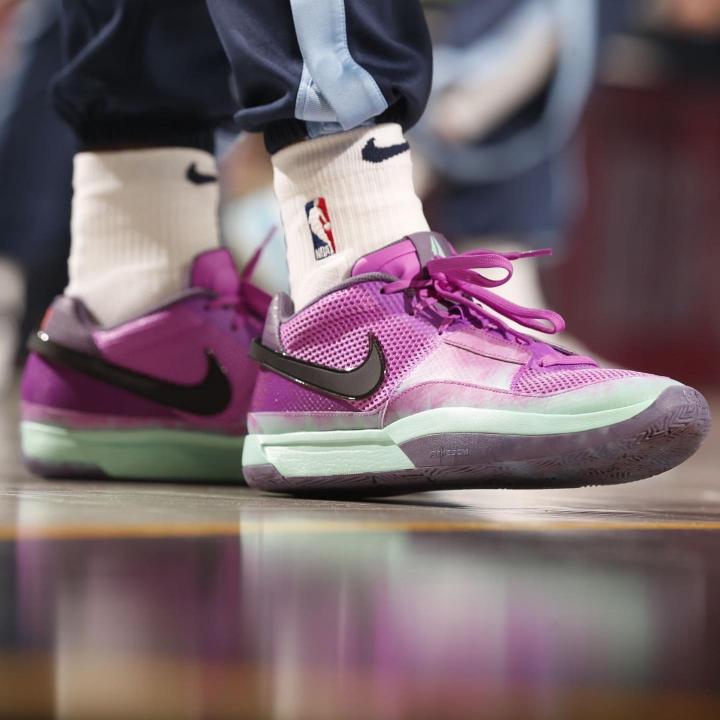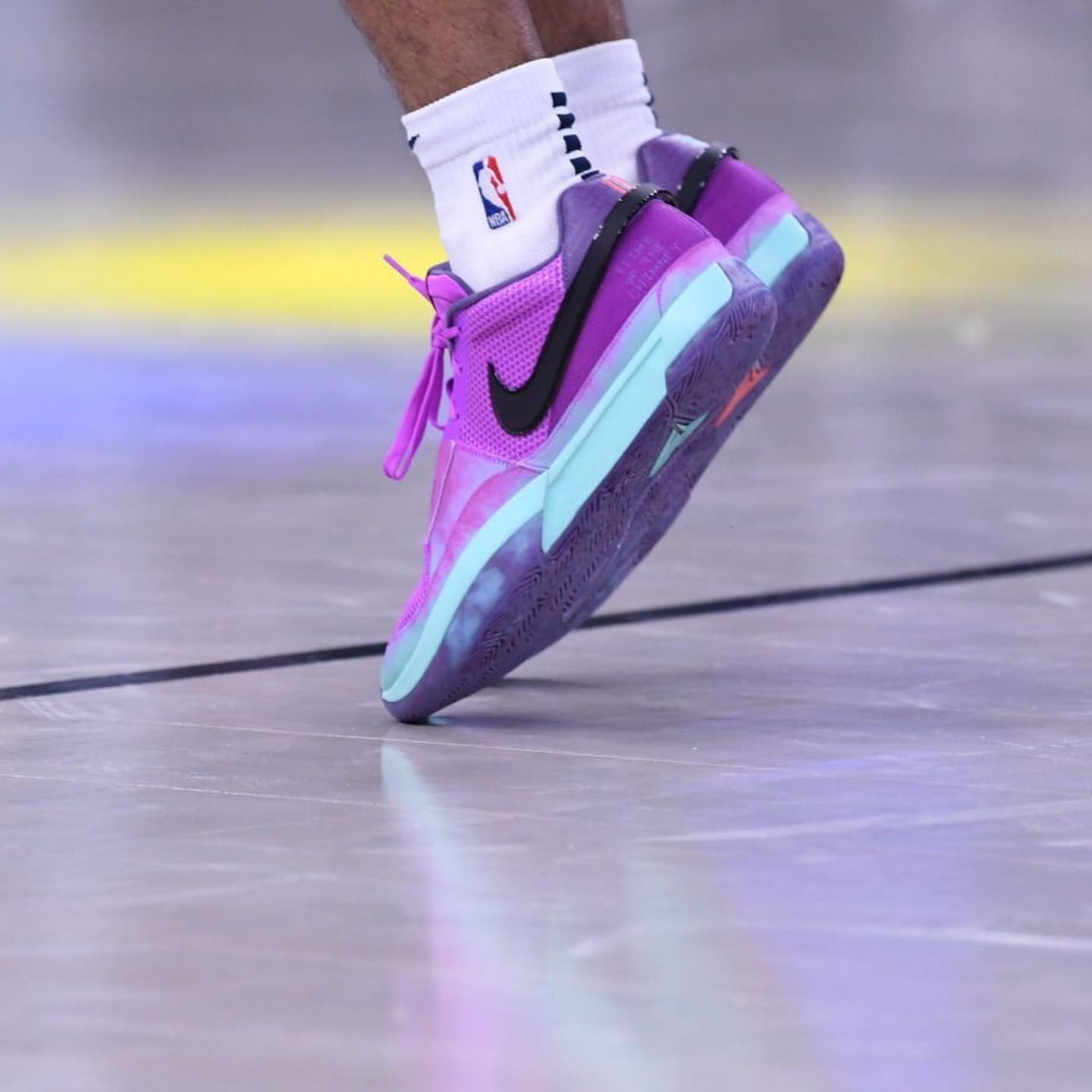 从今日莫兰特上脚「圣诞大战」配色来看,鞋面包围、外底改用紫色渐变衬托。