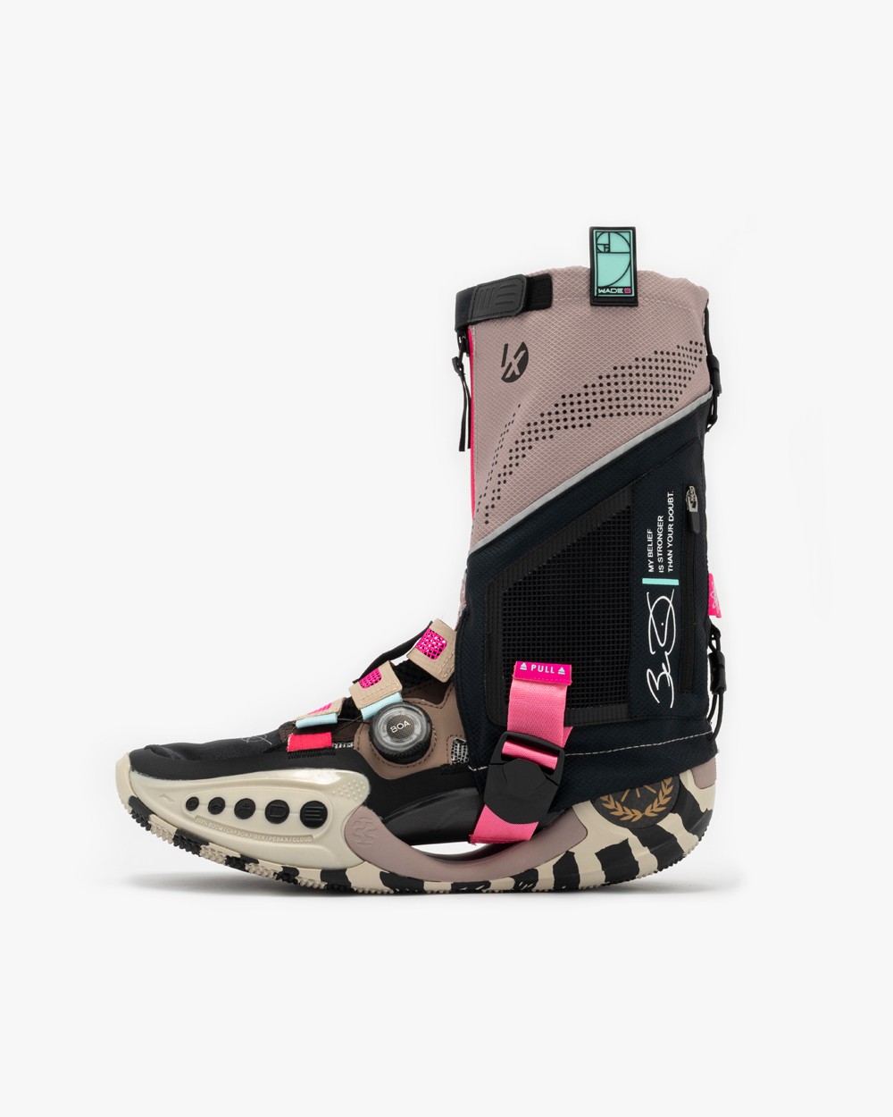 通过魔术贴绑带穿过中底孔洞,正面有方便穿脱的拉链设计,鞋侧还有口袋元素。