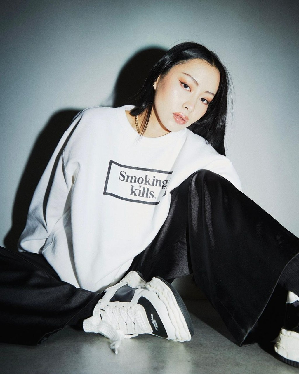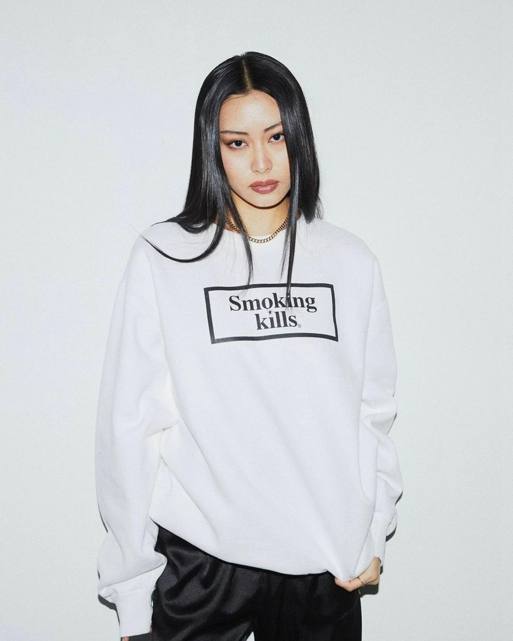 随之而来的还有服饰单品,一黑一白两种款式,设计简单却又有趣,胸口印有 “吸烟有害健康” 既讽刺又叛逆。
