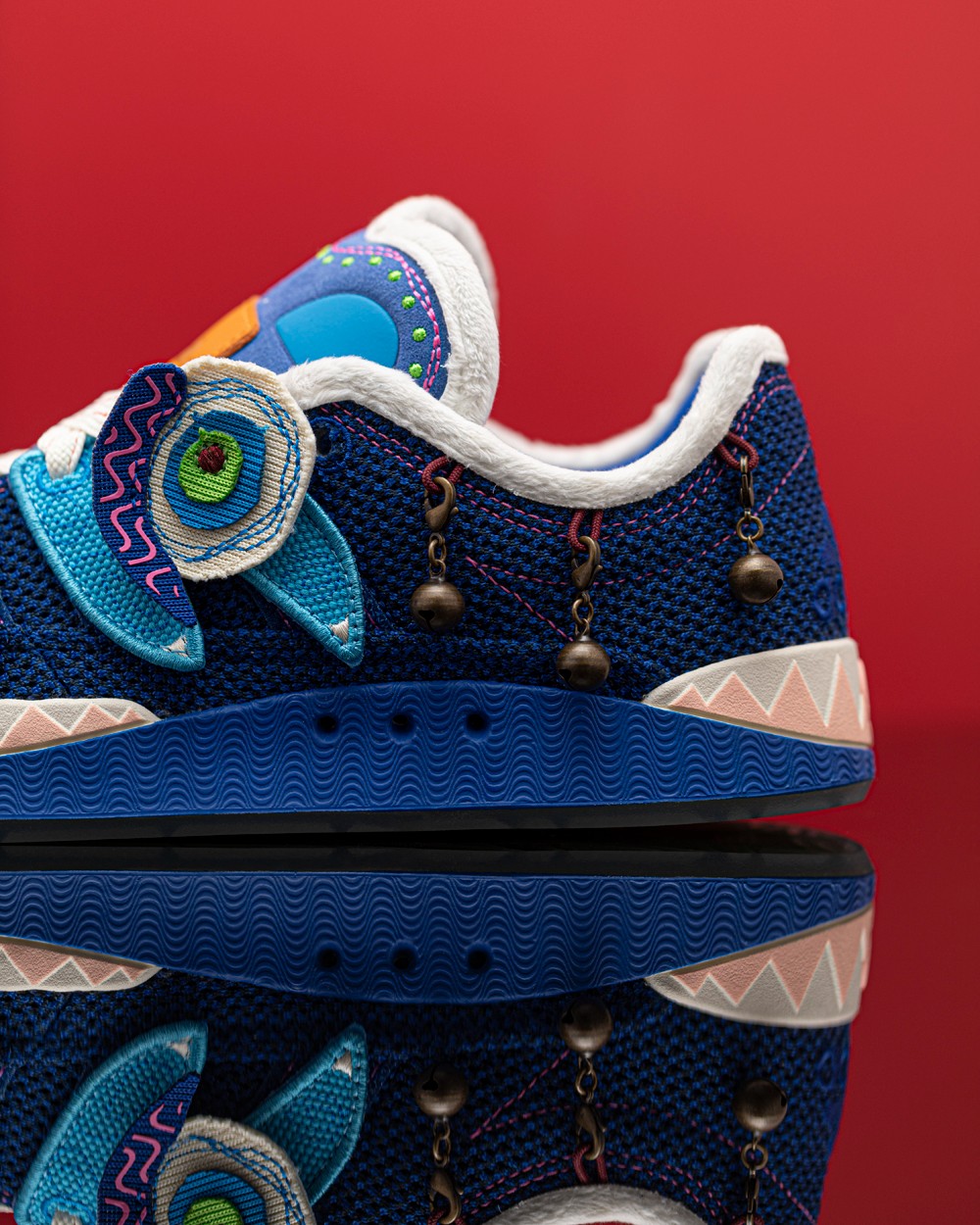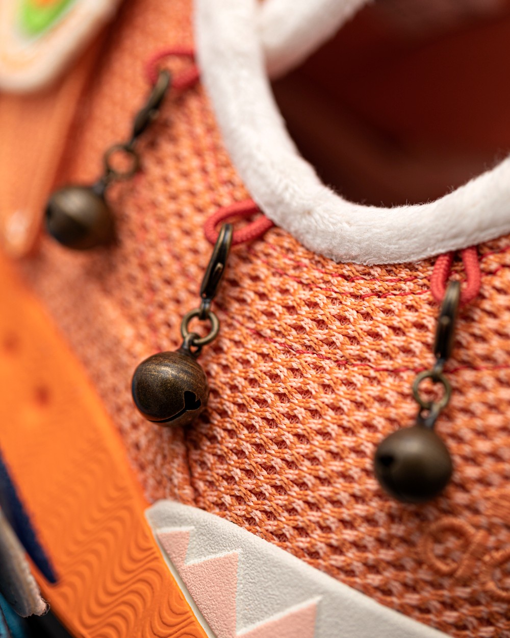 鞋帮外侧特别添加了三个可拆卸小铃铛,是走起路来会响的那种,寓意吉祥招财。