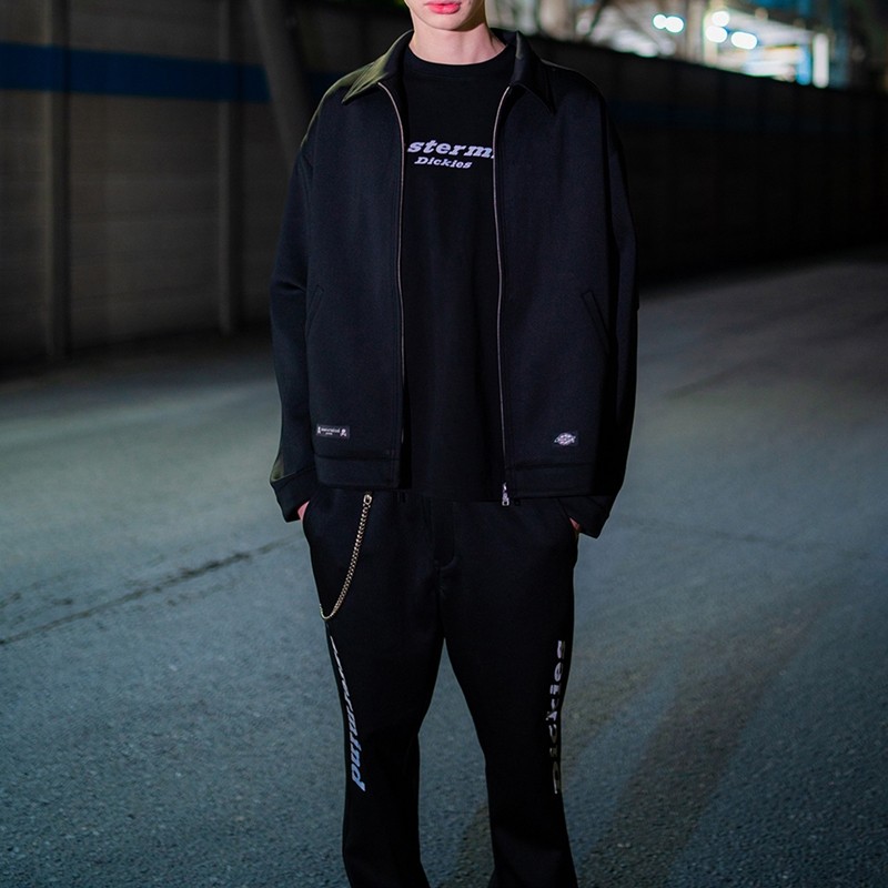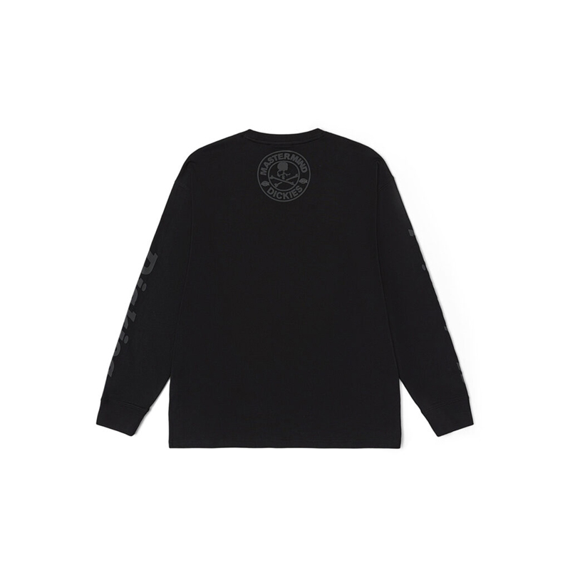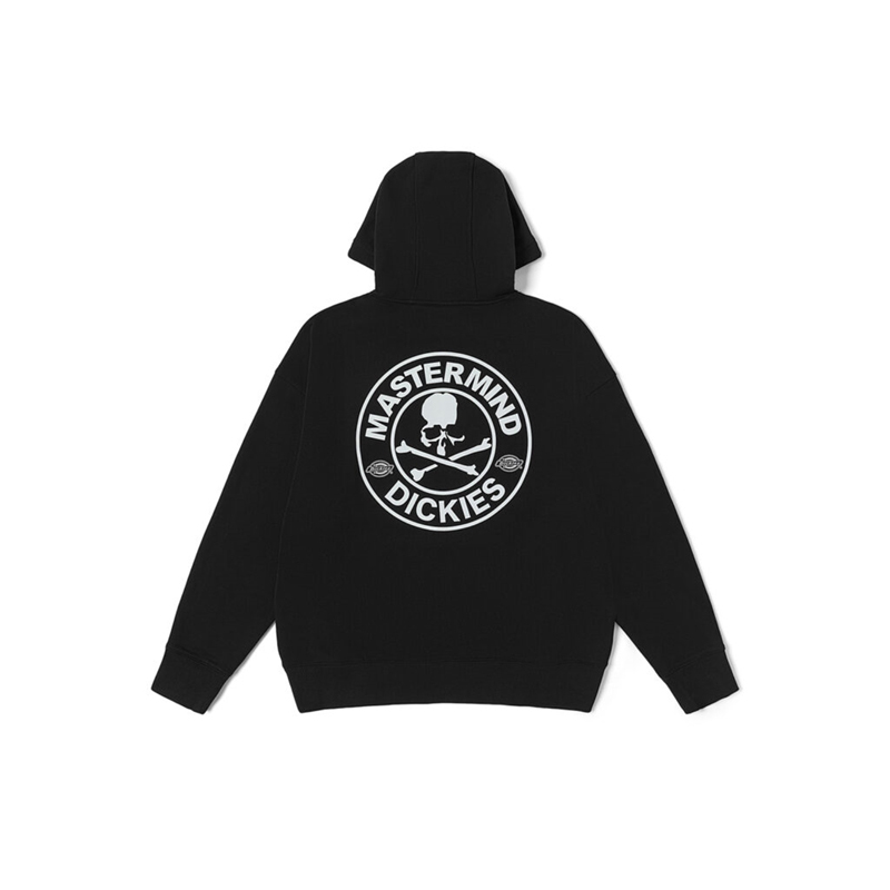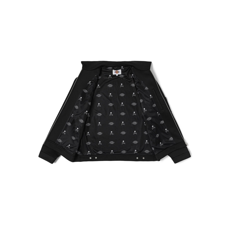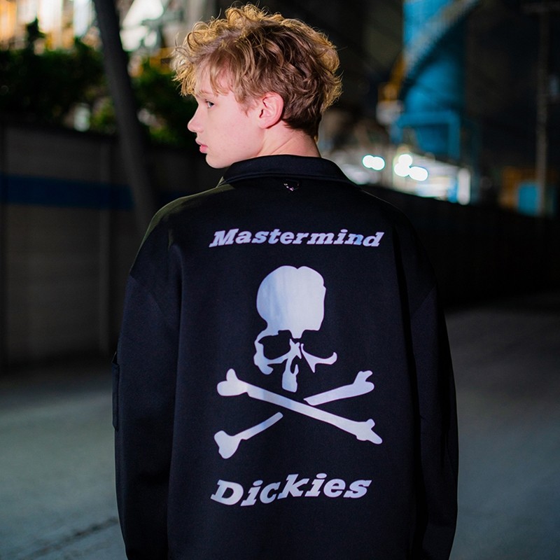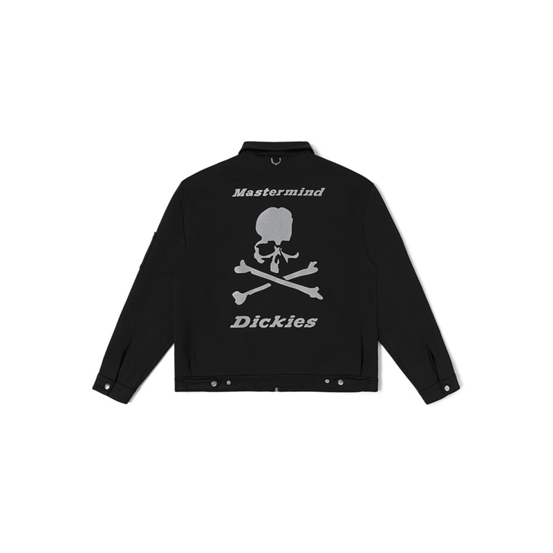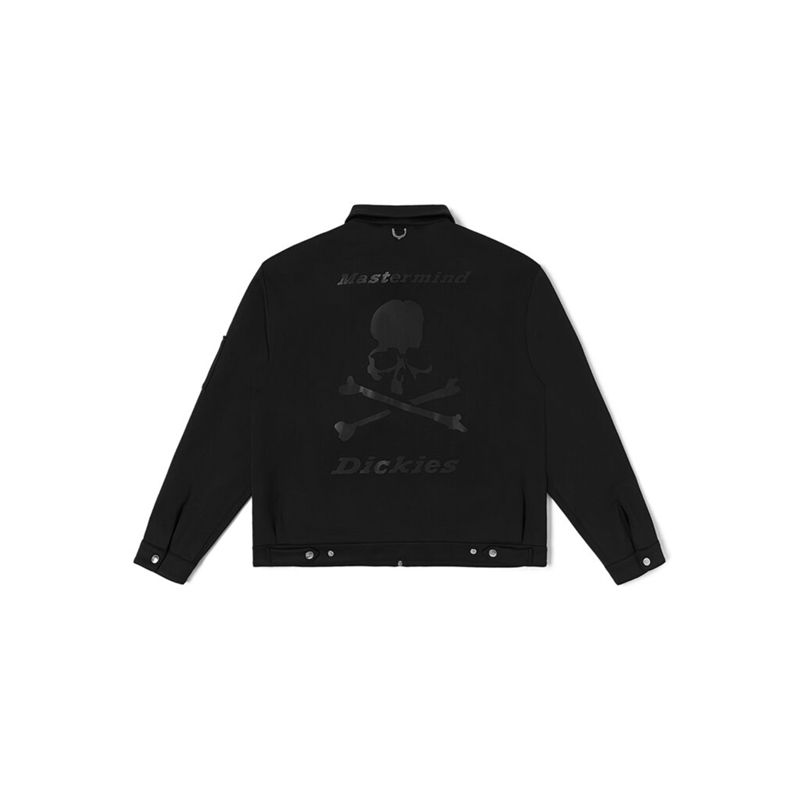 当中最值得一提的莫过于外套夹克,纯黑色造型在背后印有超大的 mastermind JAPAN 骷髅头造型,同时在上下方分别写有「JAPAN」和「Dickies」字样,彰显出联名身份。