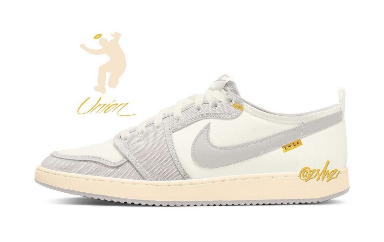 鞋头侧边车线、鞋舌以及 Swoosh 下方的标签点缀黄色,是 Union 一贯的设计手法之一。