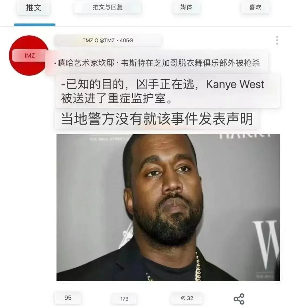 紧接着,就有 “媒体” 曝光,说 “侃爷疑似遭枪杀,人在 ICU,基本快无了”,乍一看确实让人心头一紧。