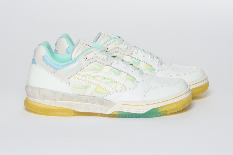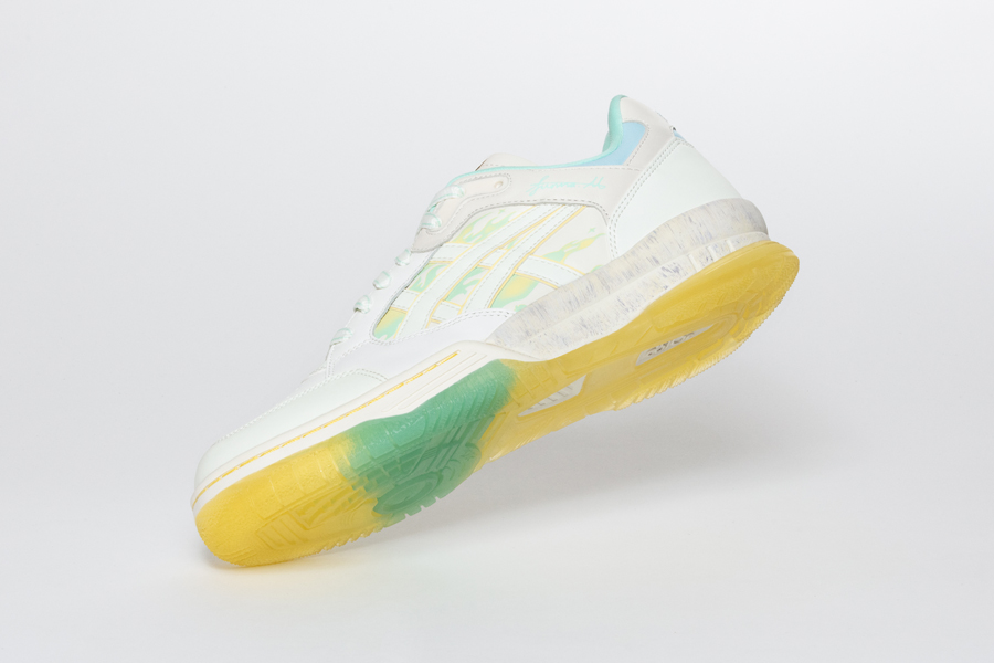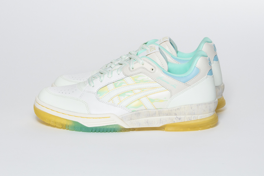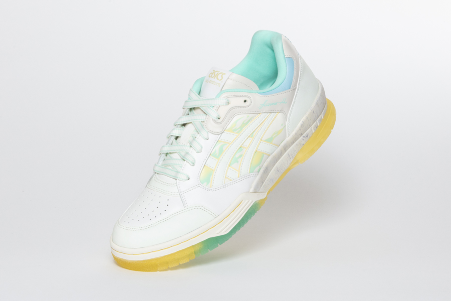 整体造型以 ASICS GEL-SPOTLYTE Low 为蓝本进行创作,设计灵感自然也是取自于「SHINE」,配色方案以白色主调,辅以糖果色调的绿、蓝、黄进行妆点,造型格外清新甜美。