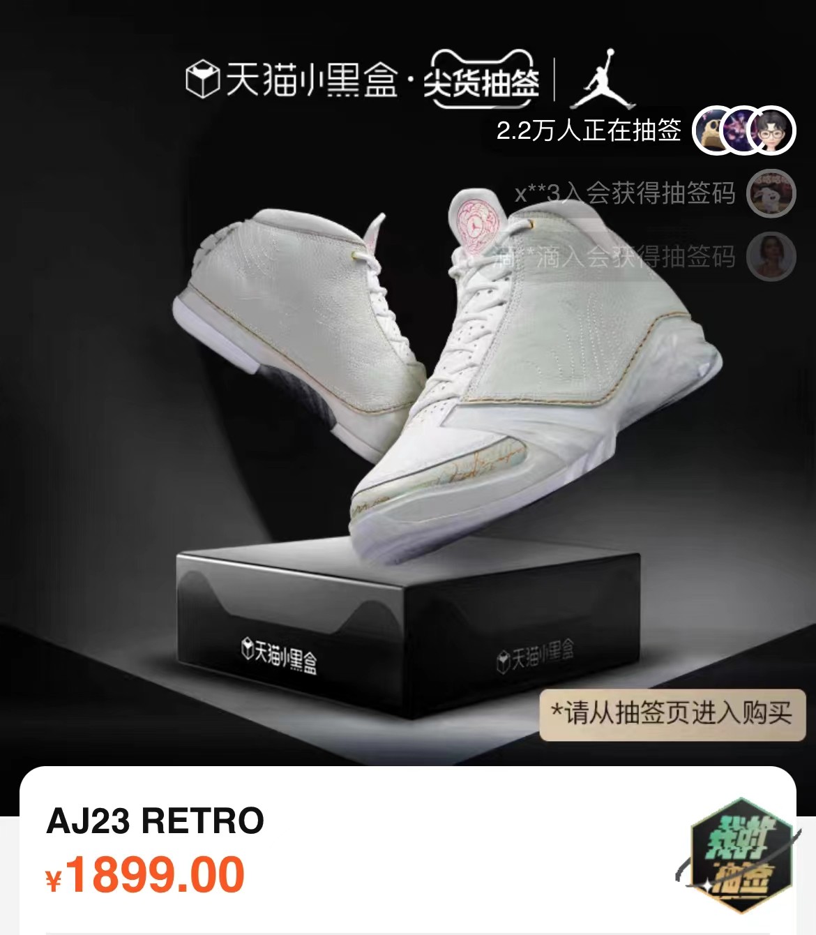 目前,现已上架天猫小黑盒开始登记(天猫搜索小黑盒点击尖货抽签,即可看到 Air Jordan 23 抽签界面),将于 1 月 1 日上午九点公布抽签结果,感兴趣的朋友记得定好闹钟!