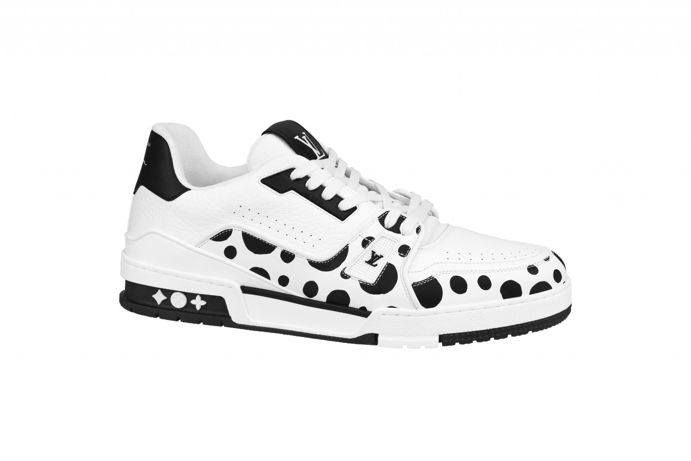 经典黑白、白绿以及白红配色设计,鞋身布满草间弥生的波点元素,展现出与印象中的 LV Trainer 完全不同的视觉效果。