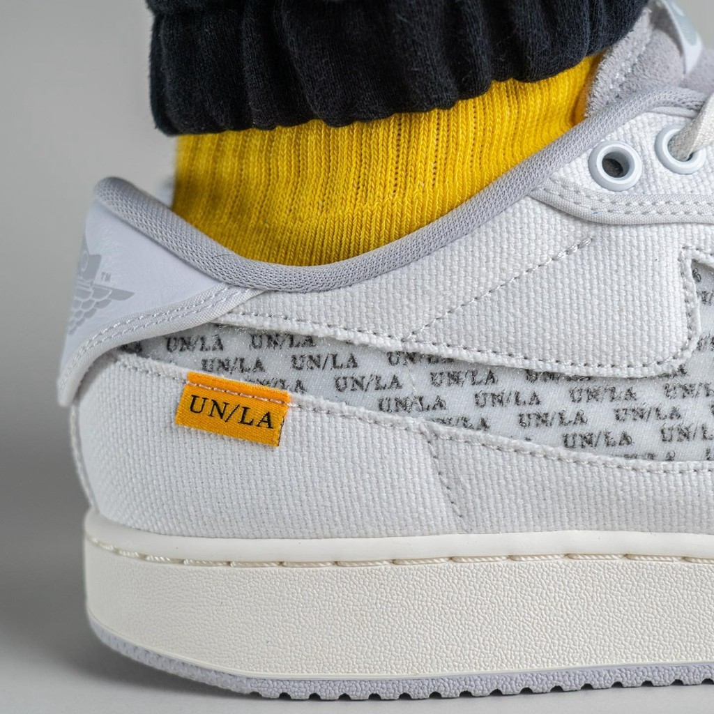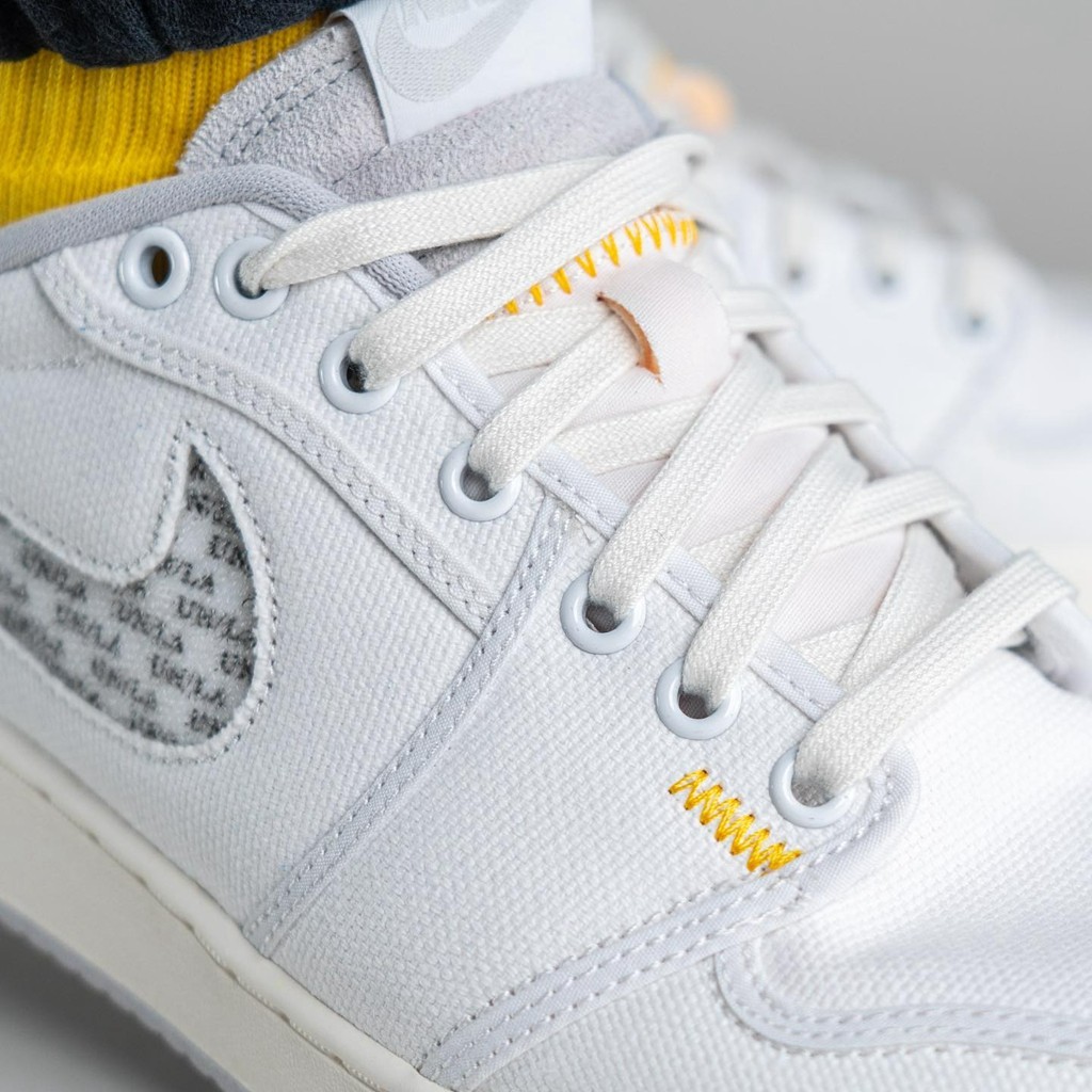 整双鞋以 Air Jordan 1 KO Low 鞋型作为设计蓝本,采用纯白色妆点,灰色和黄色点缀。