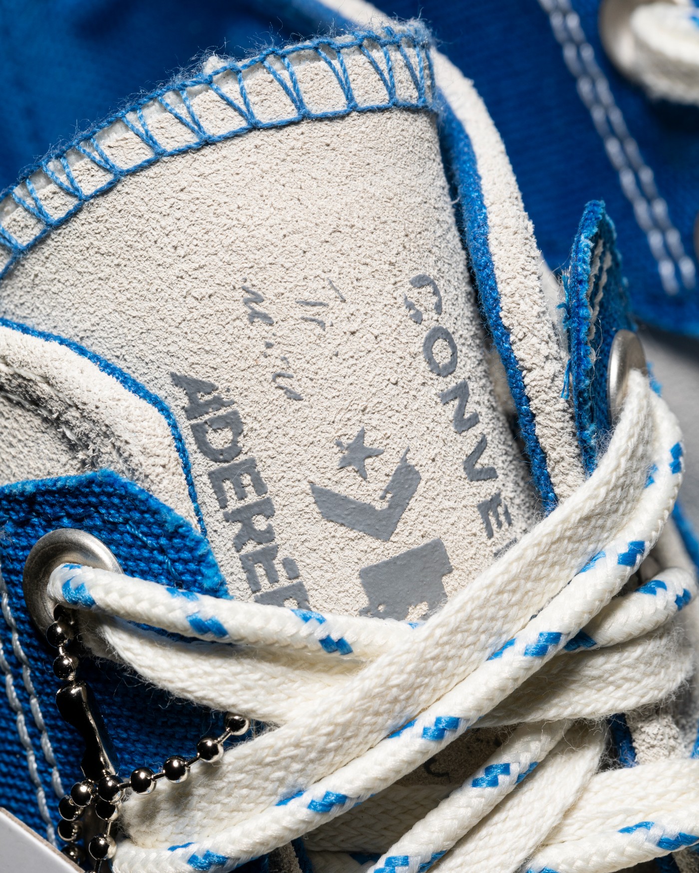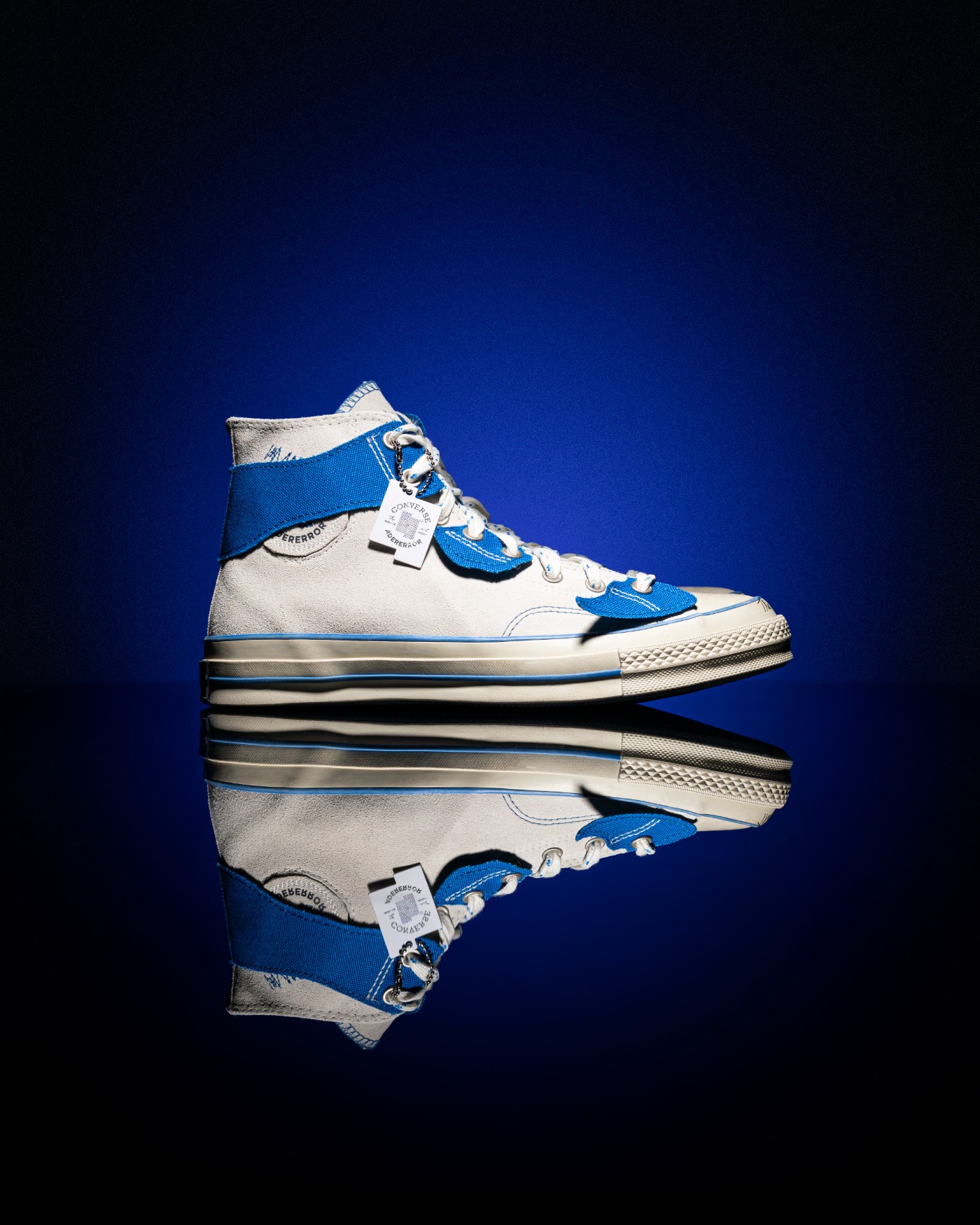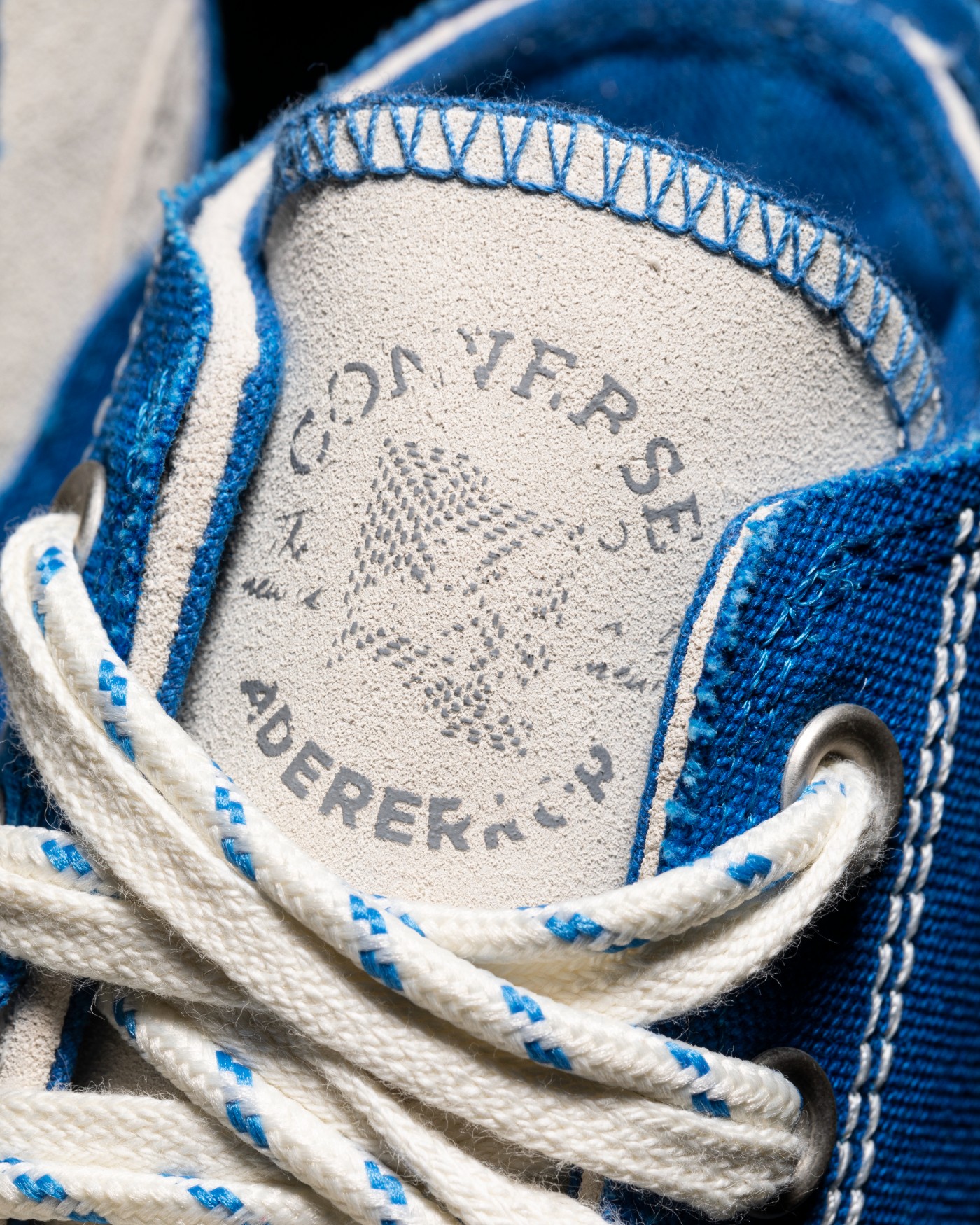 左右鞋舌印印有不同形状做旧处理的 ADER ERROR 和 Converse Logo,进一步彰显联名身份。