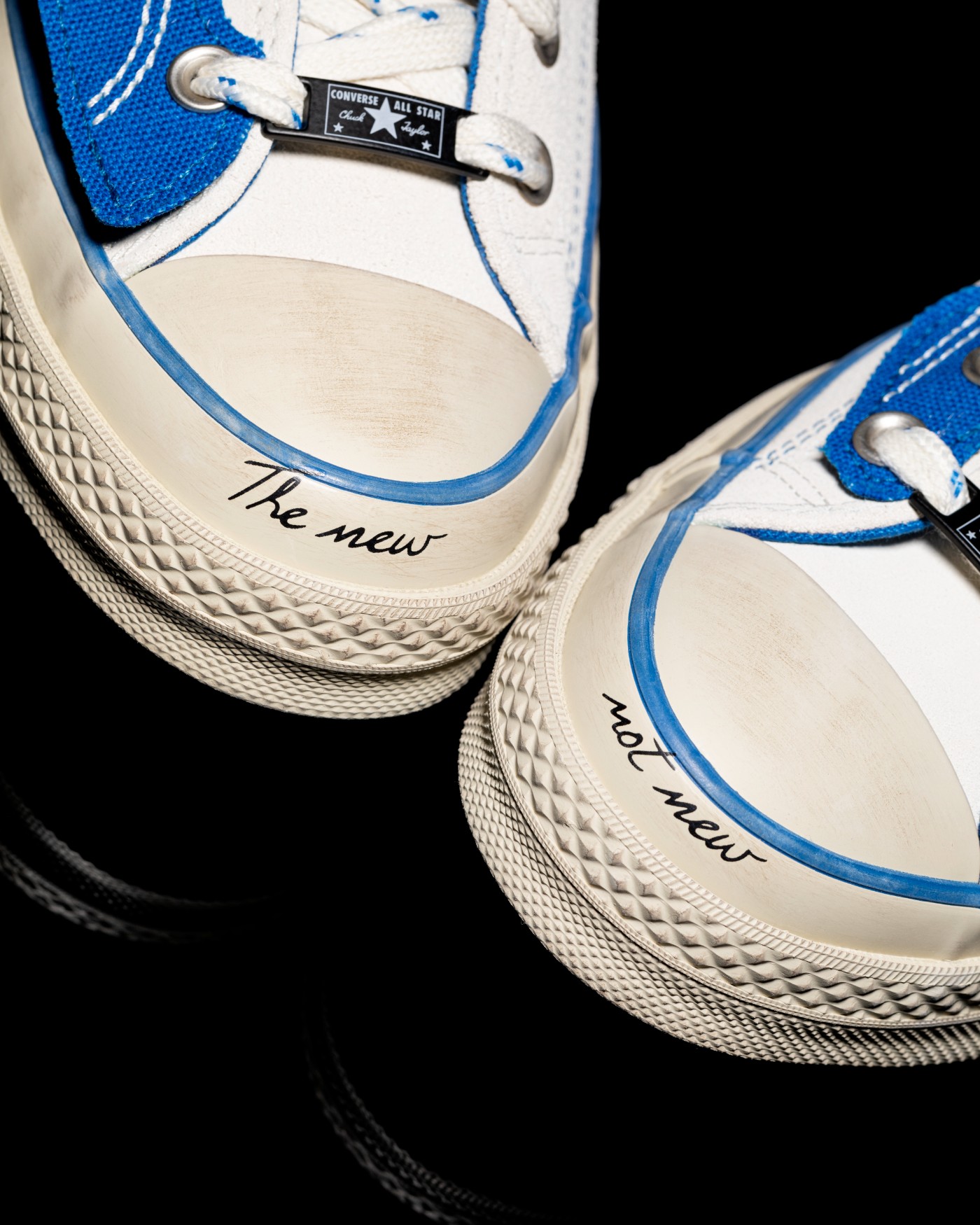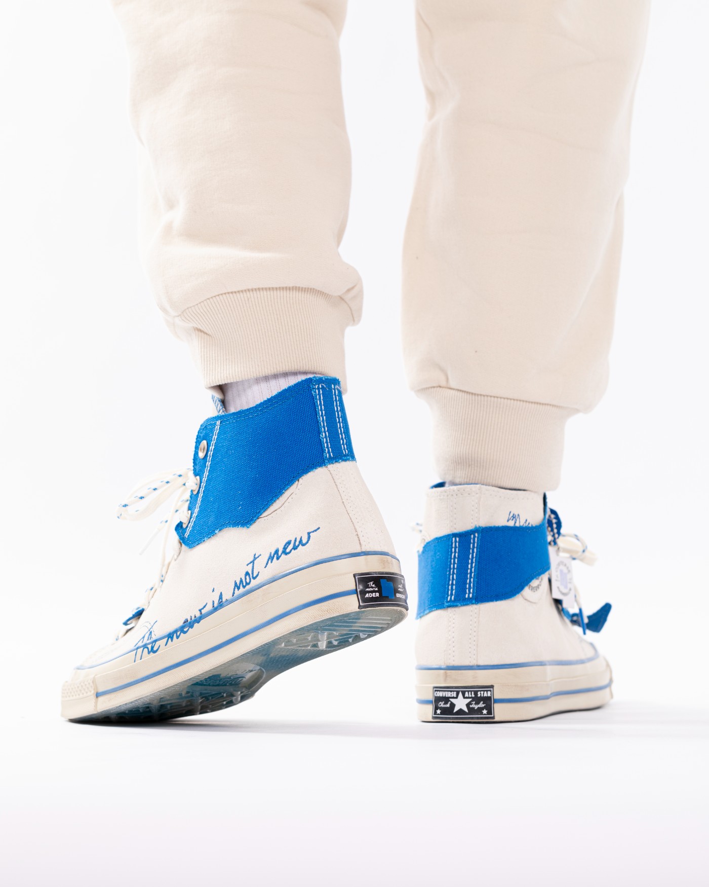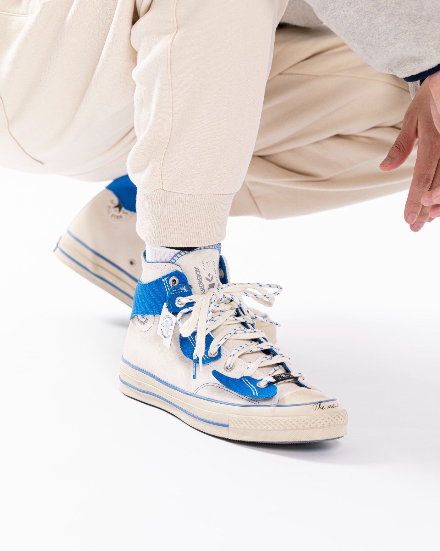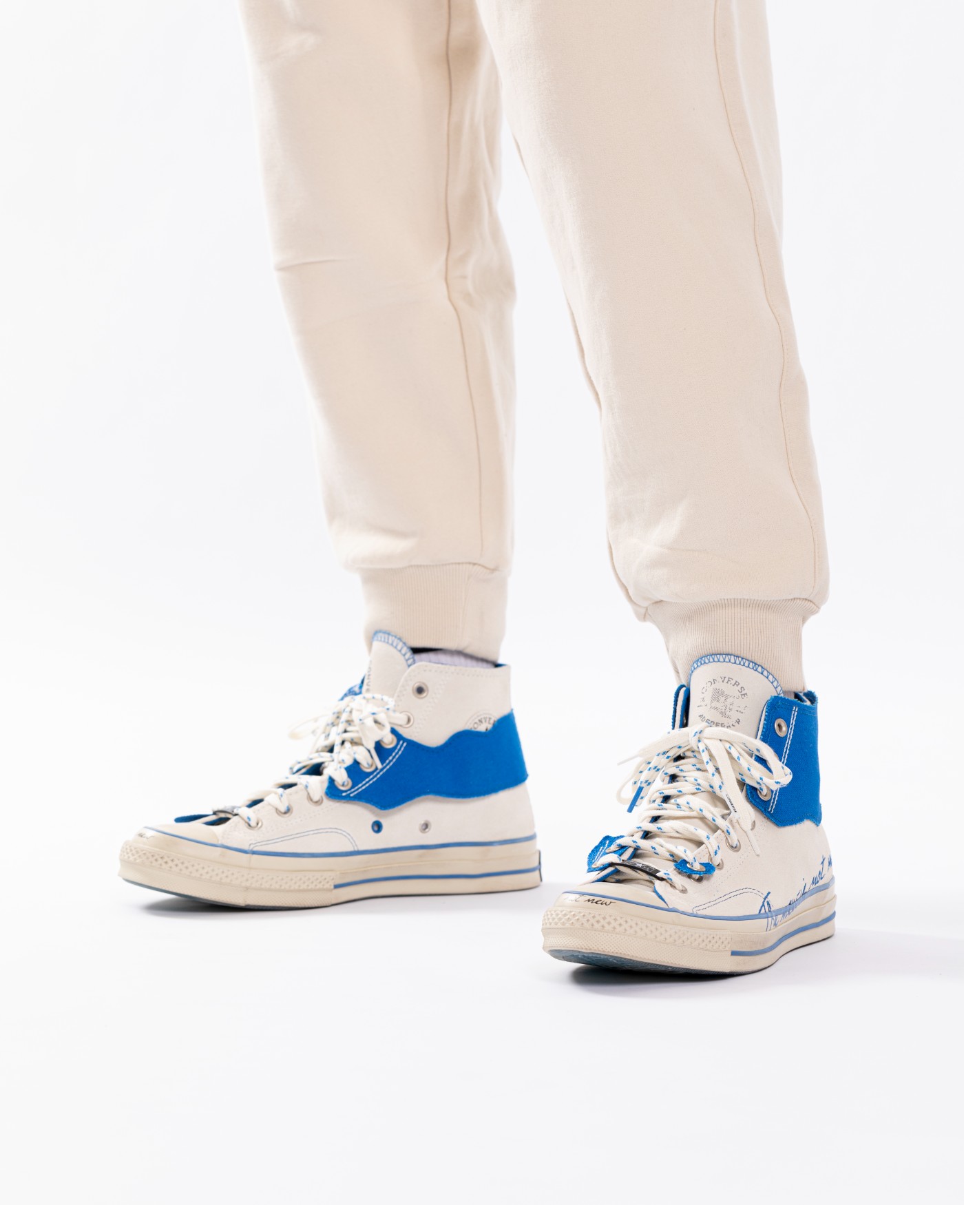 整双鞋以 Converse 经典 Chuck 70 鞋型为蓝本设计,采用做旧白色和蓝色搭配,复古气质拉满。