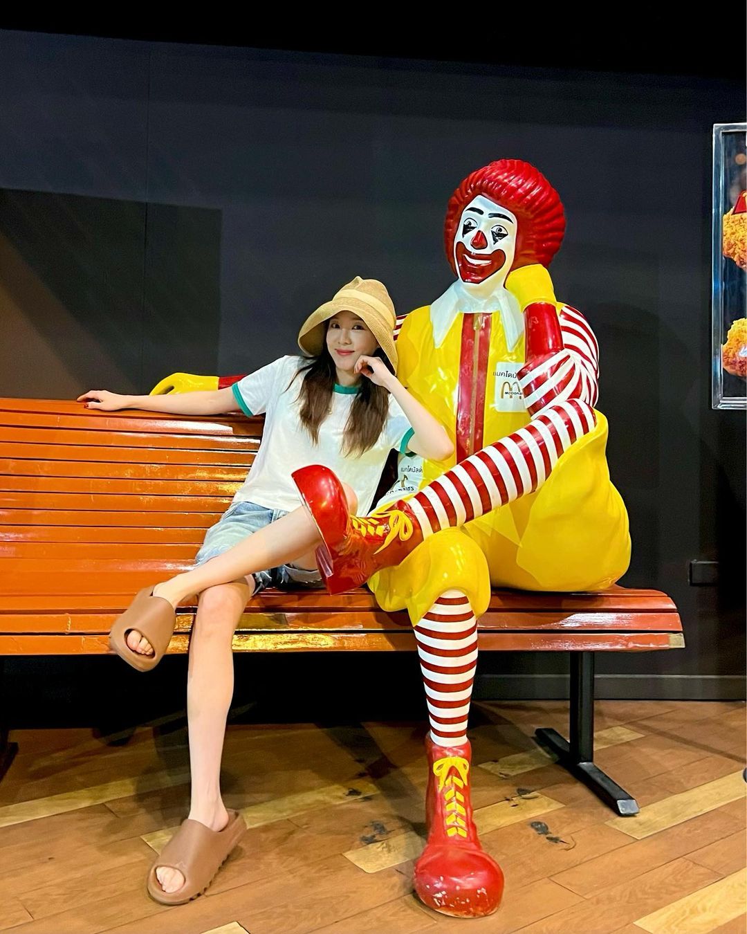 最近开启度假模式的朴山多拉穿了一双 Yeezy 拖鞋,由于配色太多,还真不容易认出具体是哪款。