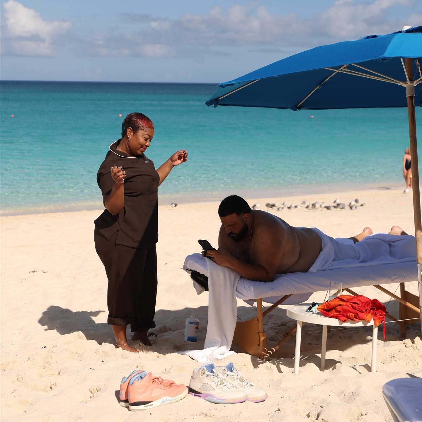 「北美景甜」为了带货真是不遗余力,就连在沙滩做 SPA 都不忘晒一波自己设计的「AJ5 彩虹套装」。