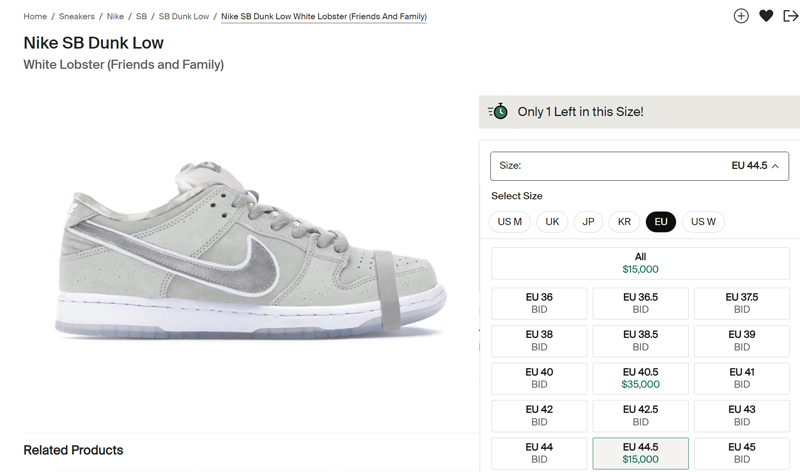 目前,全新的 Concepts x Nike SB Dunk Low “White Lobster” 仅为亲友限定版本,二级市场也仅有一双鞋款流出,导致市场价格维持在了 $15000 美元左右(44.5 码),折合人民币十万元左右。
