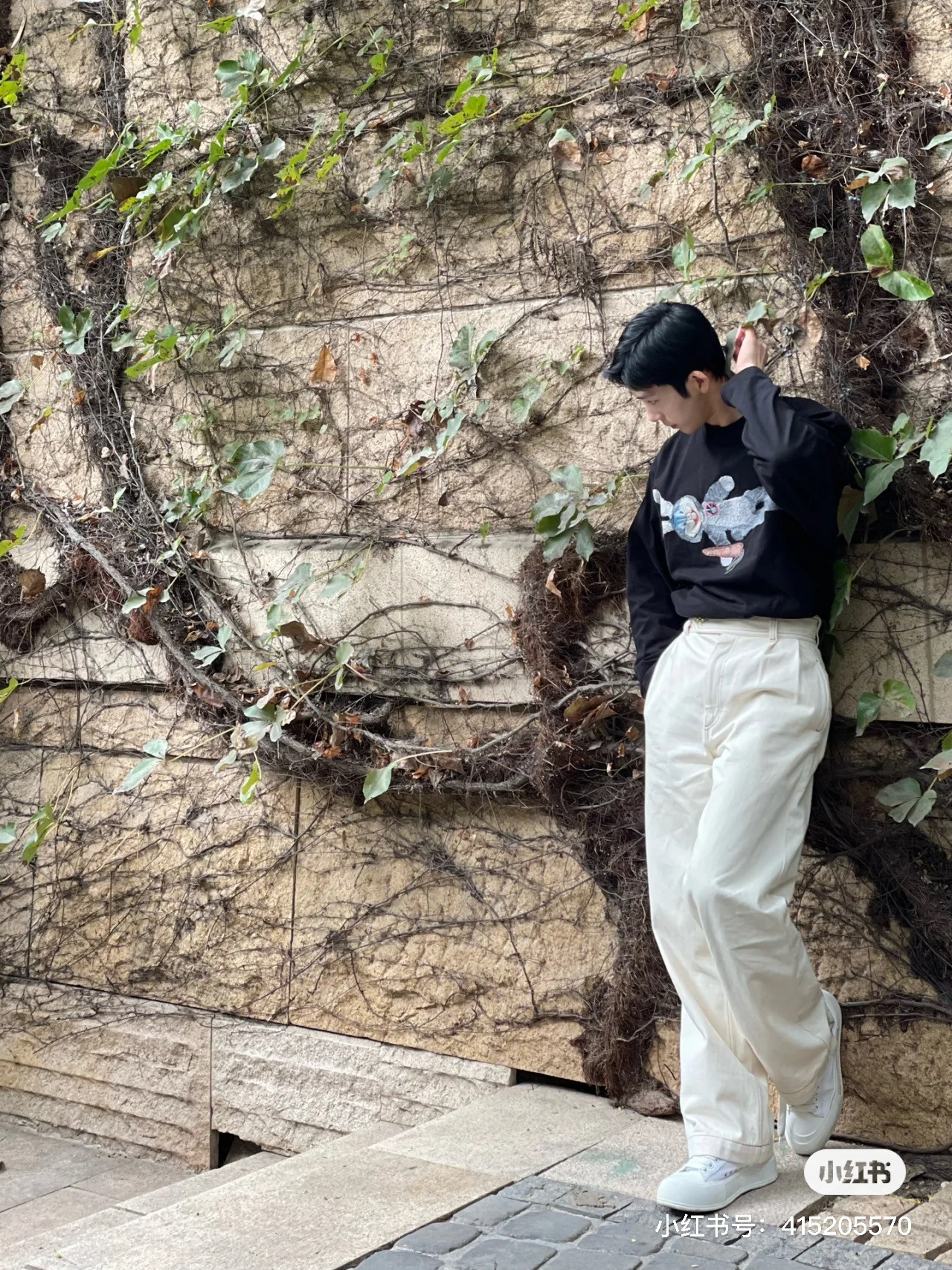 这件兔八哥联名长袖同样是来自 Razzle,搭配了一双 AlexanderMcQueen 小白鞋。
