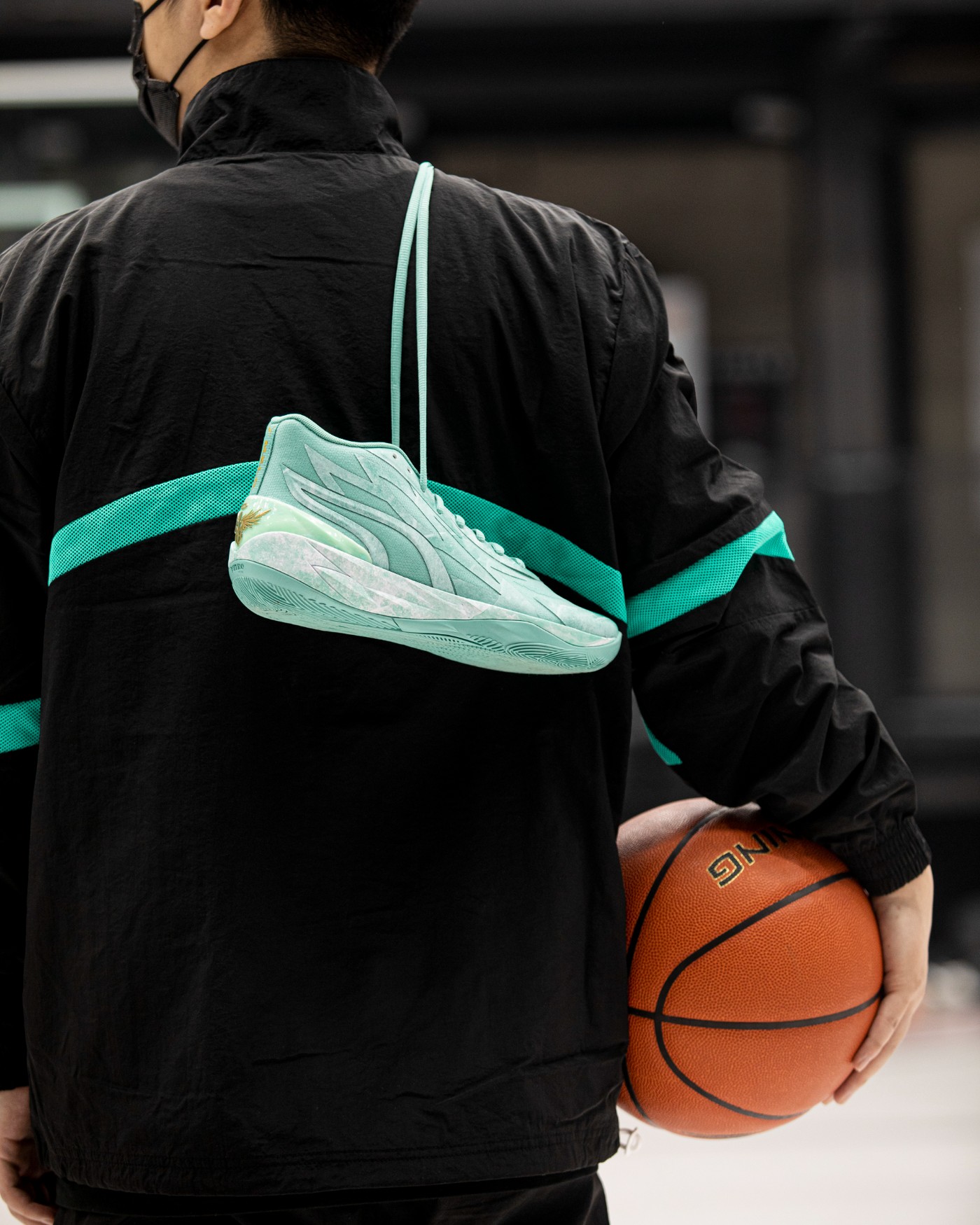 鞋舌细节缀以拉梅洛·鲍尔个人 Logo,与其胸前的纹身形成呼应,既切合了「金镶玉」主题,又彰显了签名鞋款身份。