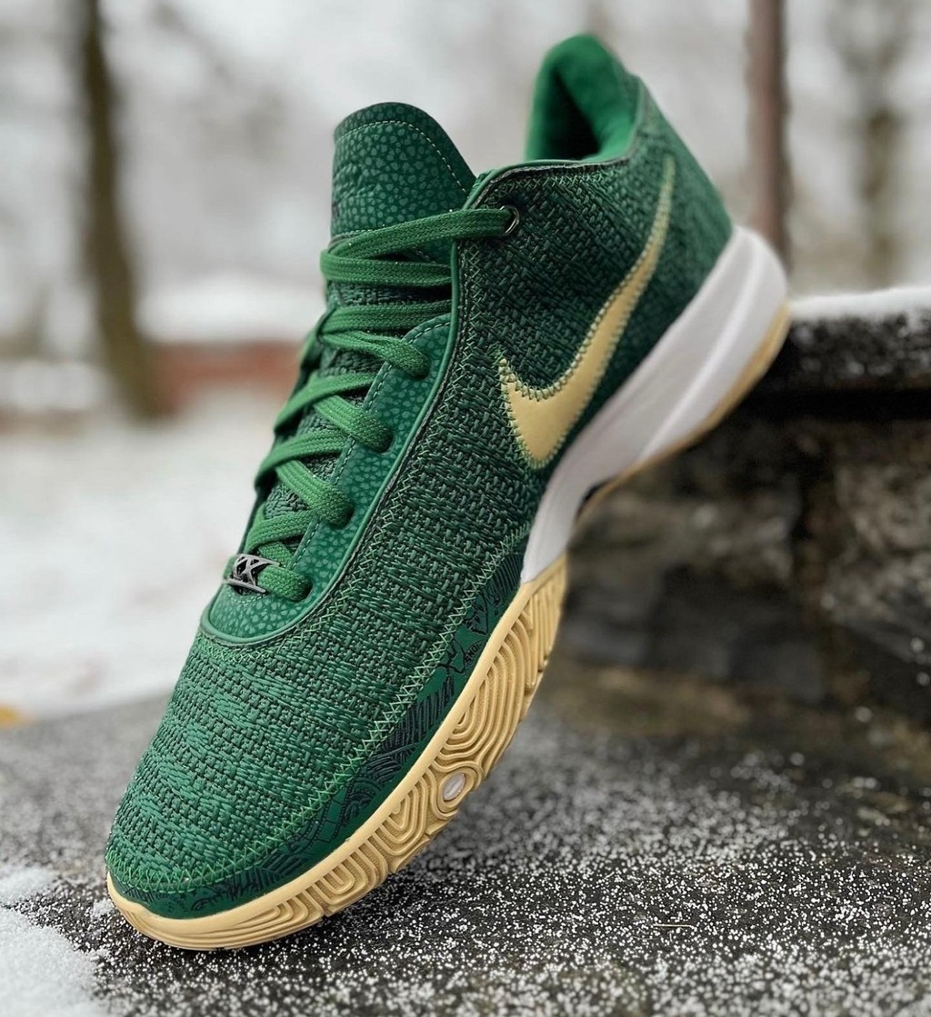 近日,海外曝光了 LeBron 20 的 SVSM PE 实物,鞋身依旧是球队传统的绿色装扮。